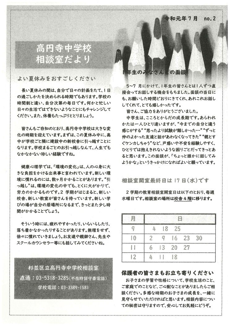 また、今年度は昼休みや放課後の時間を使って、1年生の皆さんと個別にもお話をしています。6月には、今のみなさんの様子を聞くアンケートも実施しました。ご協力ありがとうございます。このような事を通して、みなさんの様子を知っていきたいと思います。2学期からは昼休みと放課後、相談室を開放します。相談したい人はもちろん、特に悩みはないけど、顔を見せに寄ってくれることも大歓迎です。みなさんに会えるのを楽しみにしてます。