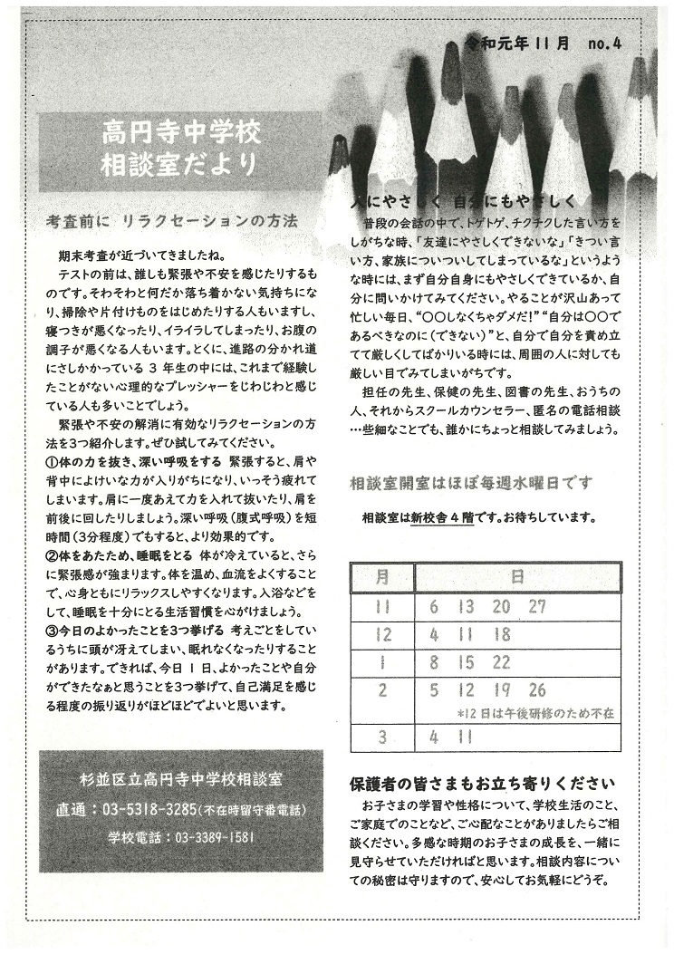 6月を迎え、入学・進級から2ヶ月がたちました。新しい環境や学級にもなれてきたことと思います。これから季節は梅雨を迎えます。また、前期の中間テストも目前に迫ってきました。学校生活でもいろいろな面で負荷がかかってくるころかもしれません。先日から昼食の時間を活用して生徒のみなさんと話す機会も設けていきますが。休み時間や放課後は相談室にいつきていただいても大丈夫です。また、ゆっくりとお話がしたいという場合には予約することも可能です。気軽においでください。また、保護者の皆様の相談も受け付けております。担任や養護教諭または