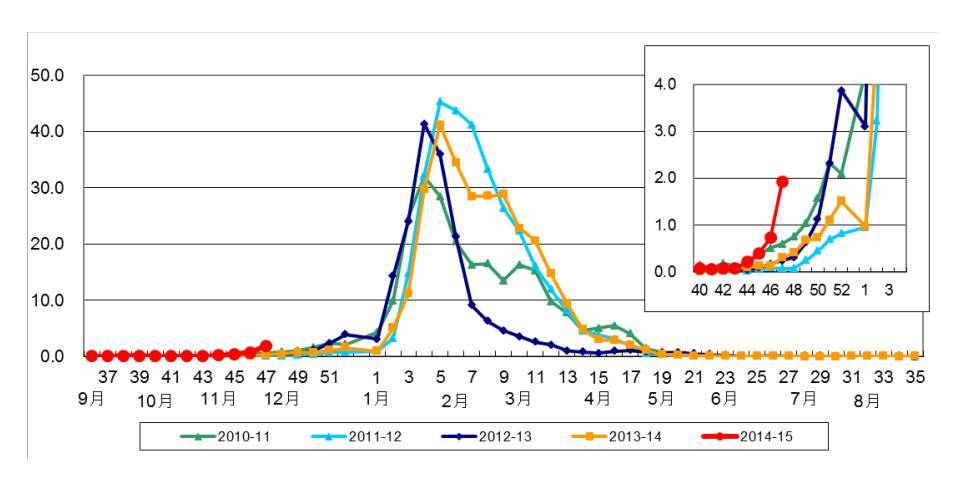 都内のインフルエンザ定点医療機関からの第47週(11月17日から11月23日)の患者報告数が、流行開始の目安となる定点当たり1.0人を超えました。過去5シーズンにおいて最も早い流行開始となっています。