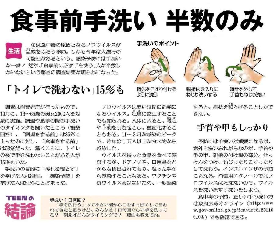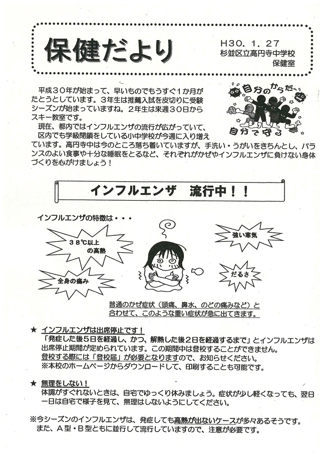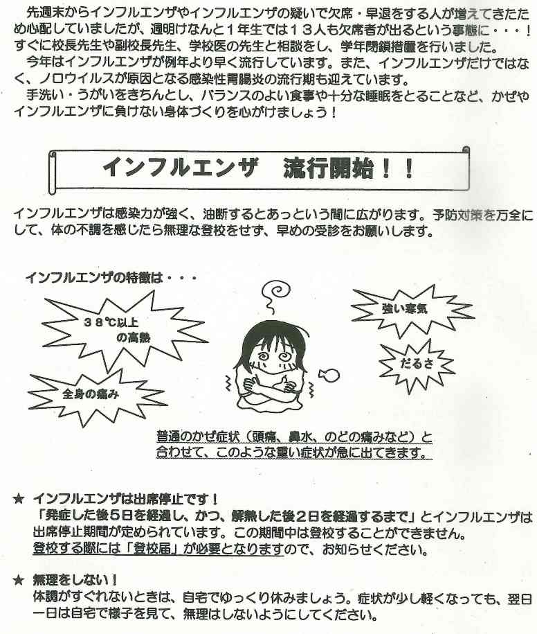 今後も感染の拡大が予想されますので、手洗いの徹底、室内の適度な加湿や換気、休養を十分に取るなど、更に感染の予防に努めましょう。