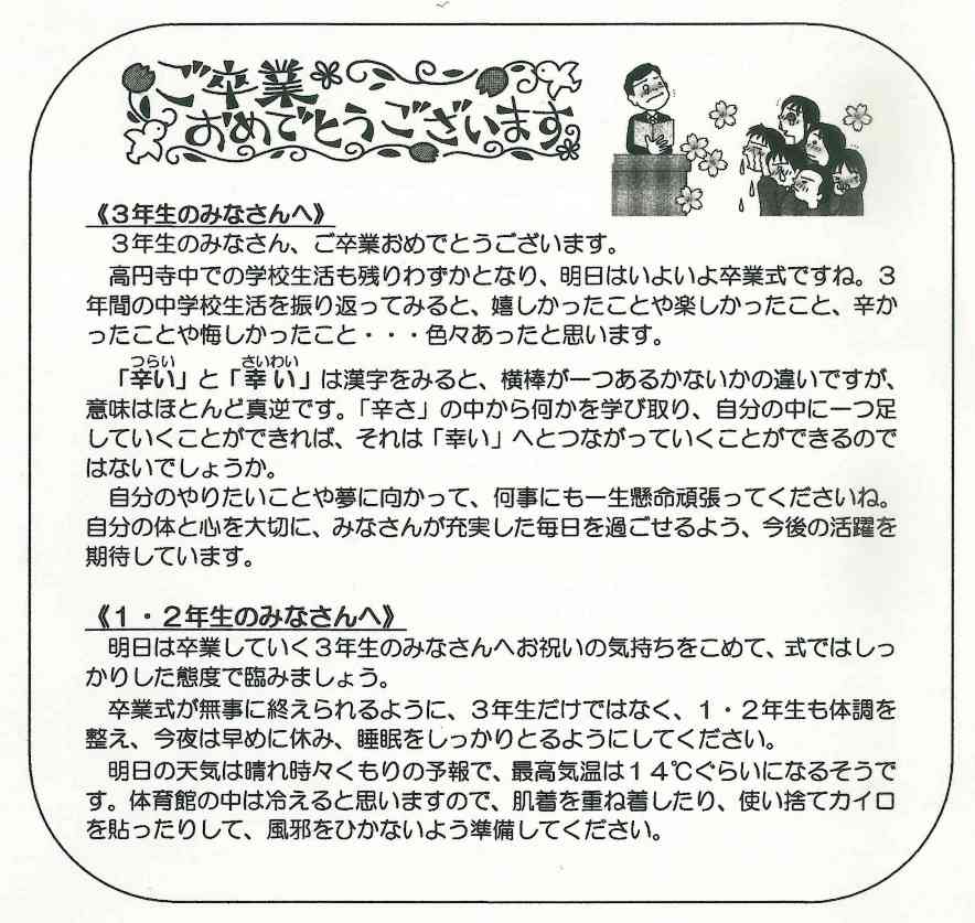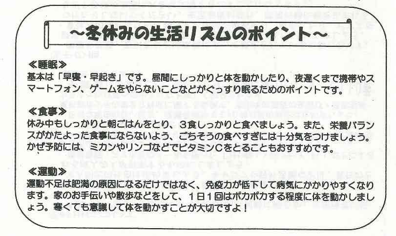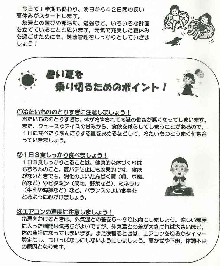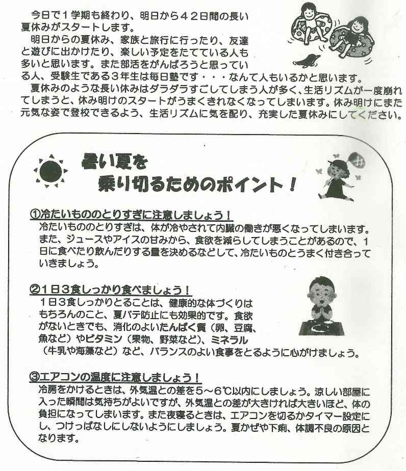 あすから45日間の長い夏休みがスタートします。夏休みには家族と旅行に行ったり、友達と遊びに出掛けたり、楽しい予定を立てている人も多いと思います。また、部活をがんばろうと思っている人、受験生だから毎日勉強などという人もいるかと思います。夏休みのように長い休みにはだらだらしてしまう人が多く、生活リズムが崩れてしまうと、休み明けのスタートがうまく切れなくなってしまいます。休み明けに元気に登校できるように、生活リズムに気を配り、充実した夏休みにしてください。