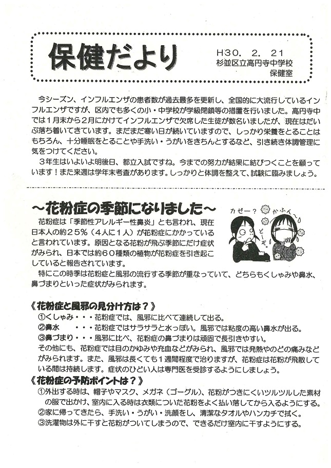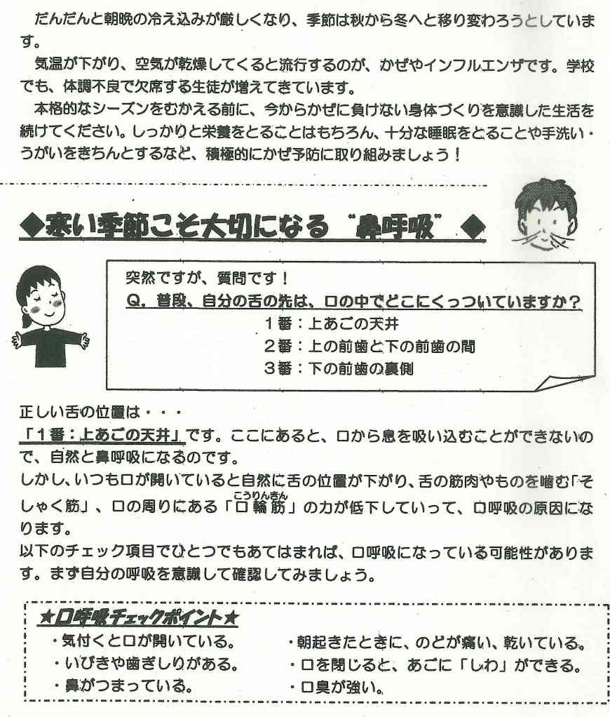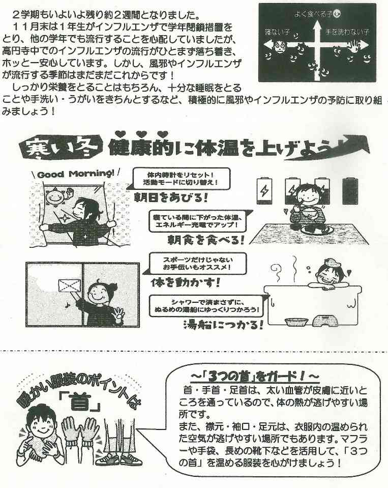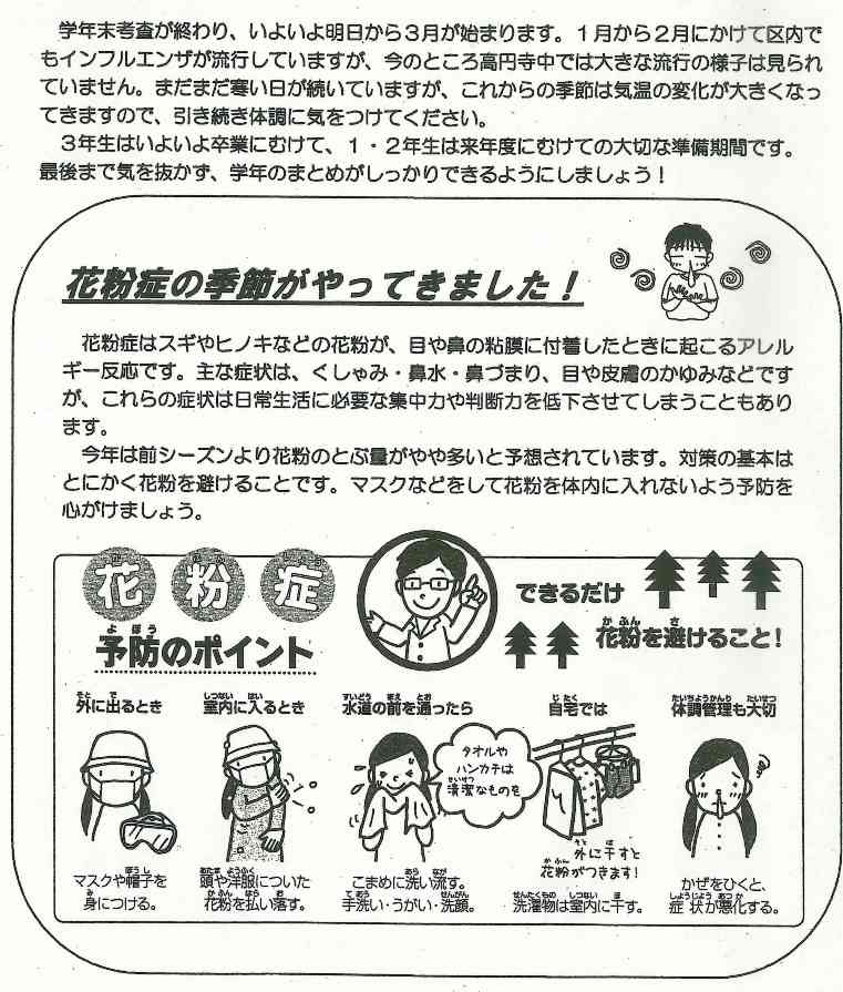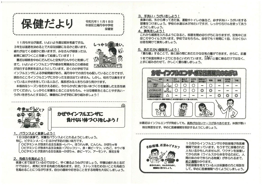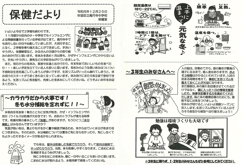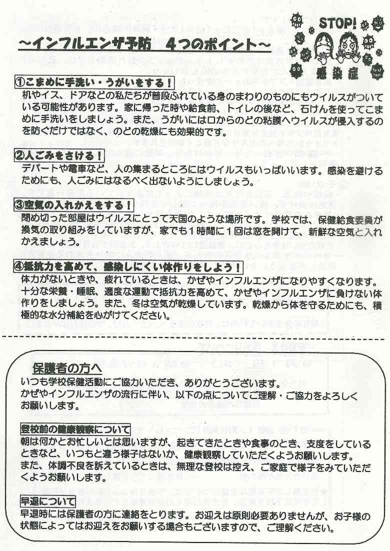学校では、手洗い、うがい、換気の励行の他に、各教室にエコ加湿を実施します。流行期にはマスクの着用を指導していますので、合わせてご家庭では清潔なハンカチ、ティッシュ、マスクを持たせていただくようお願いします。
