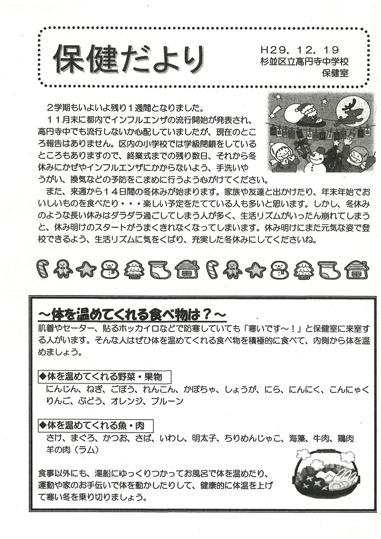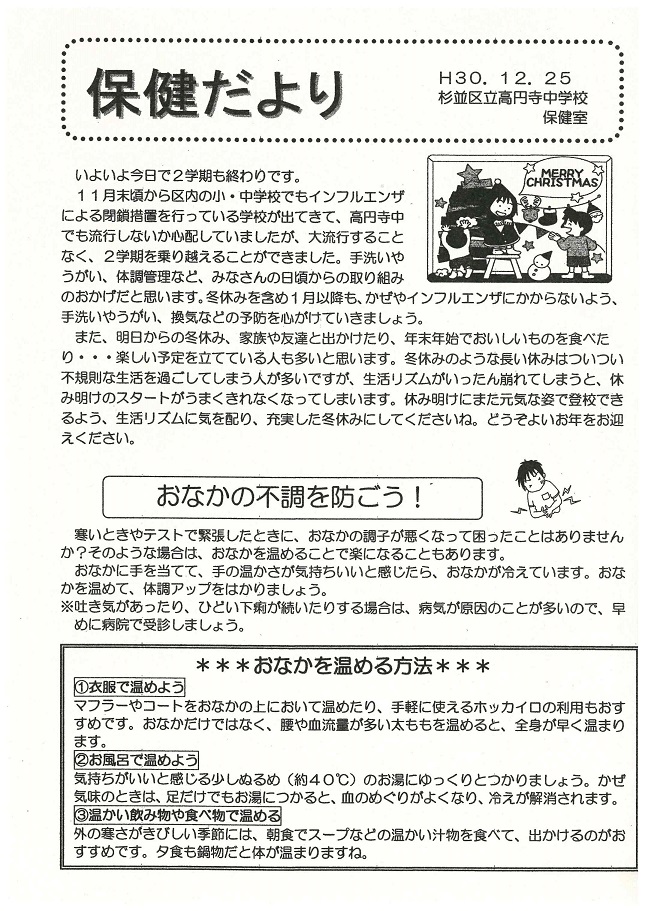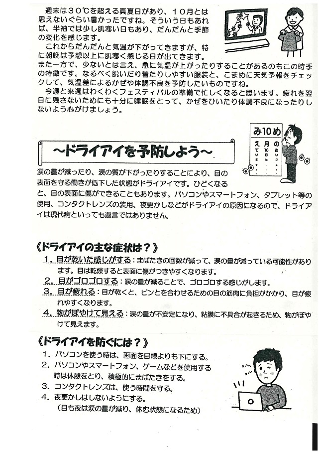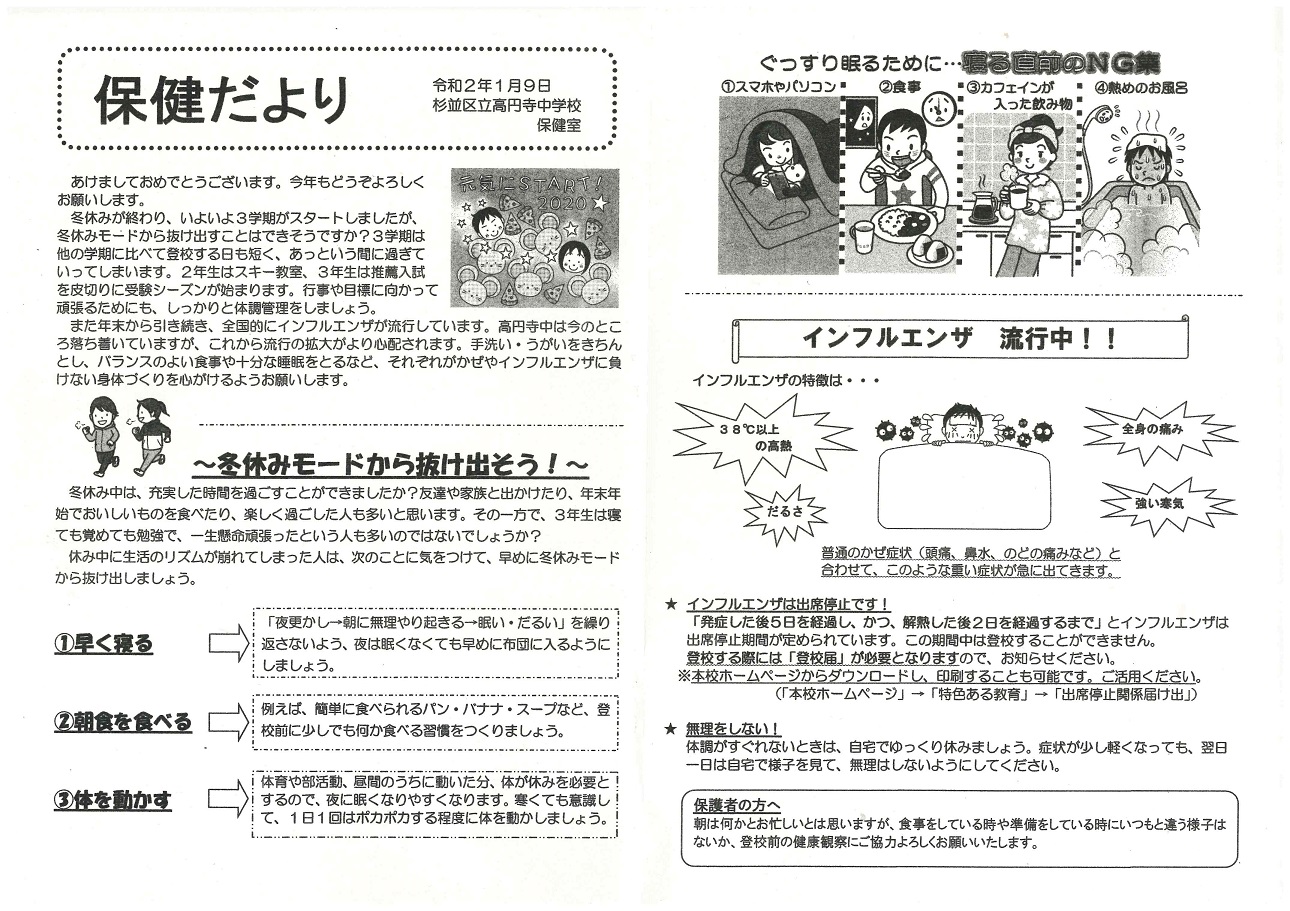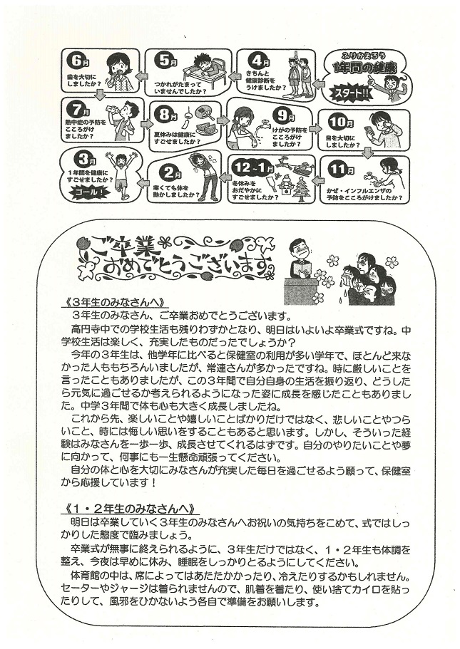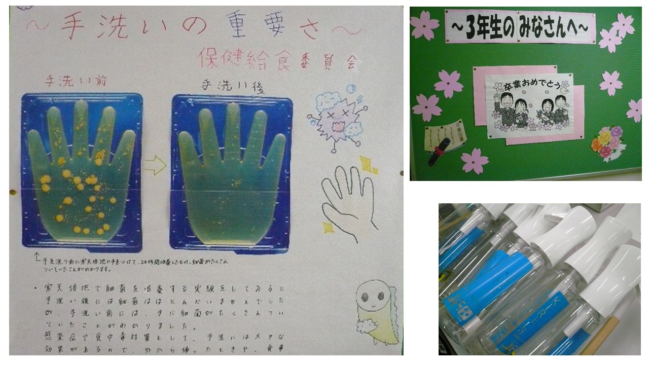 学校では、手洗い、うがい、換気の励行の他に、各教室にエコ加湿を実施します。流行期にはマスクの着用を指導していますので、合わせてご家庭では清潔なハンカチ、ティッシュ、マスクを持たせていただくようお願いします。