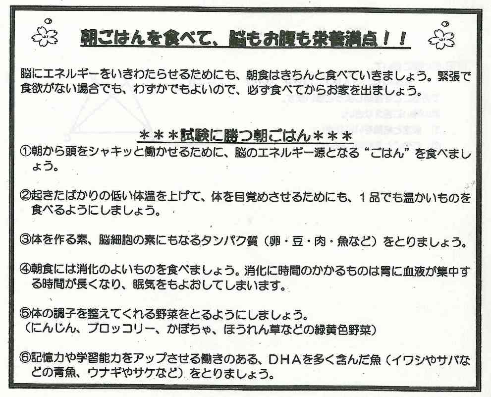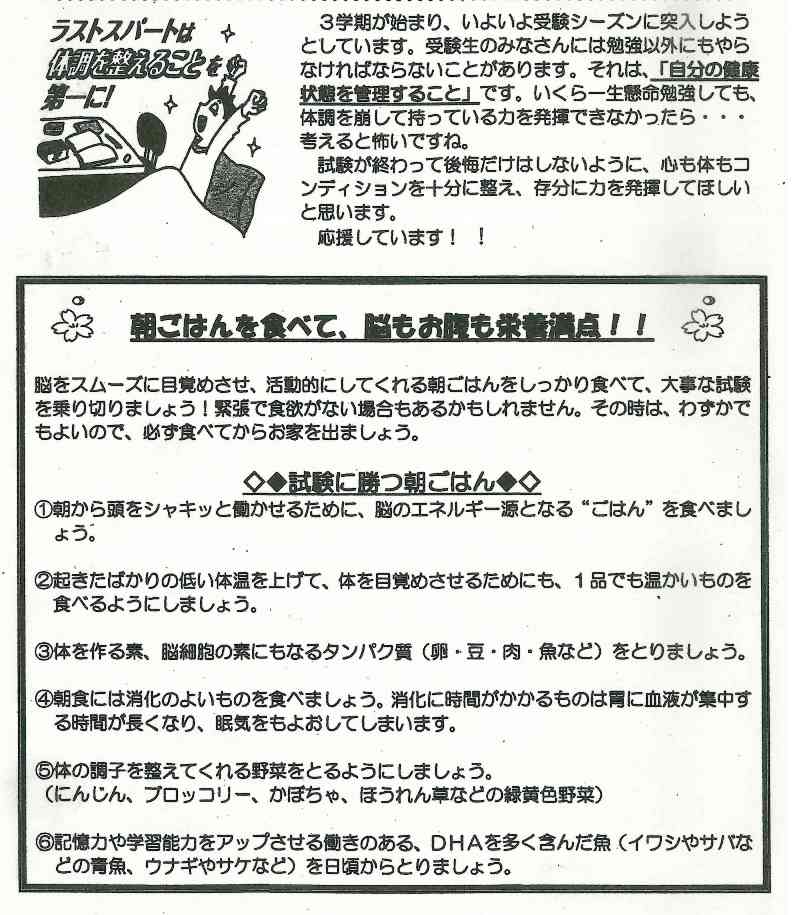 いよいよ入試シーズンに突入です。心も体もコンディションを整え、100%以上の力を発揮するためには、睡眠と食事が重要です。よりよく頭の調子を整えるためには,深い眠りが必要です。深い眠り(ノンレム睡眠)には、夜寝る前に十分リラックスすることが大切です。そのためには