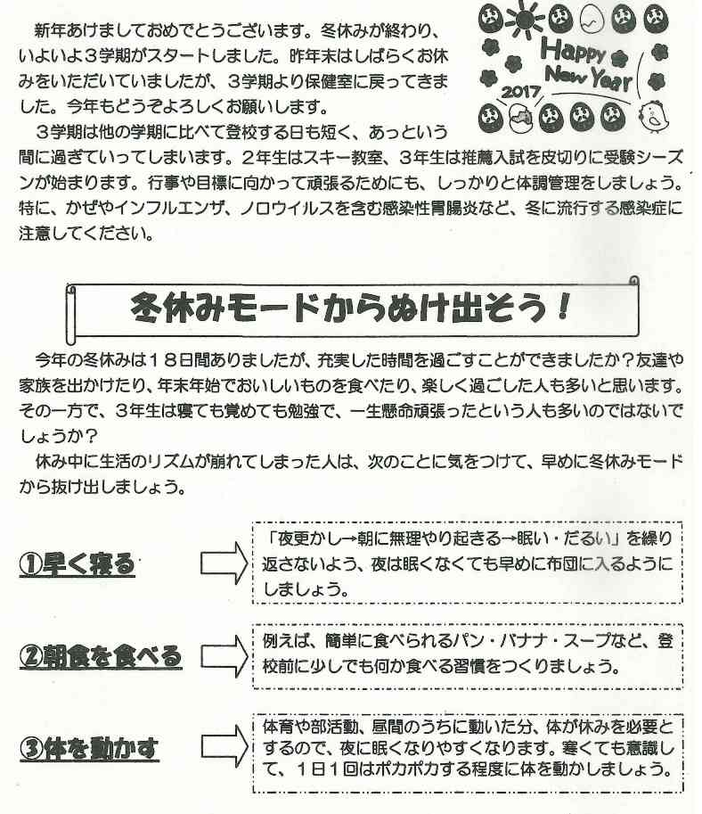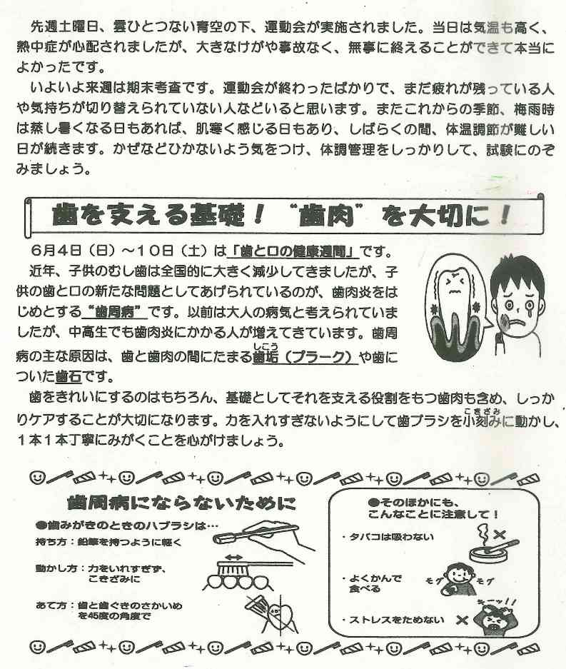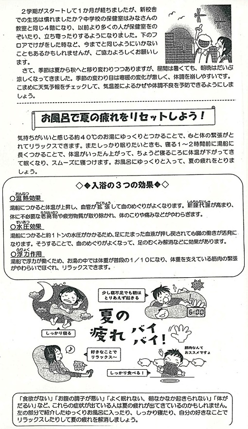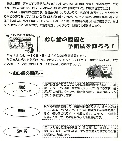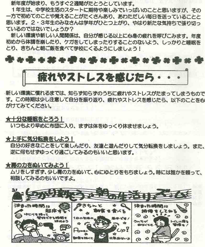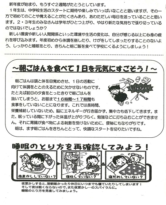 新学期がスタートして1か月が過ぎました。この時期、新しい環境に慣れようとして自分でも気付かないうちに疲れがたまっているものです。さらにゴールデンウイークでともだちと遊んだり、家族で出かけたりと休養がとれていない人も多いかもしれません。疲れがたまりやすいこの季節をしっかり乗り切るためにも、きちんと睡眠をとり、朝ごはんを食べて学校に来ましょう。