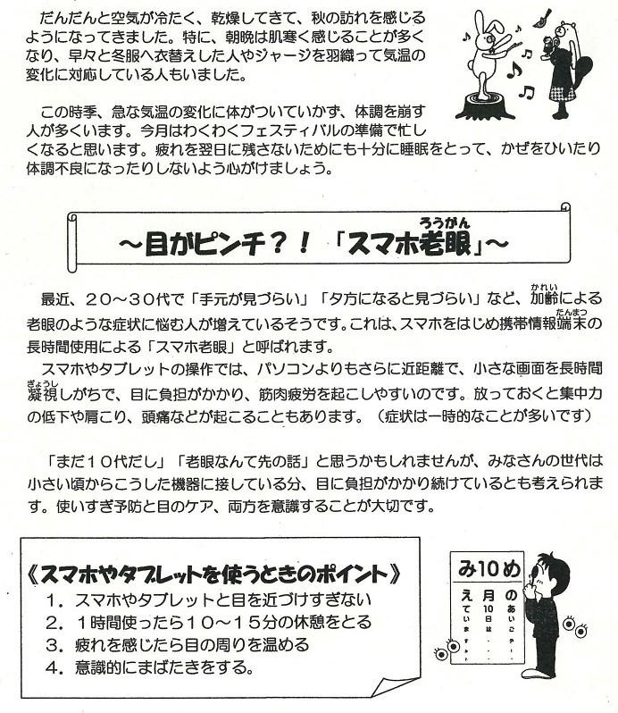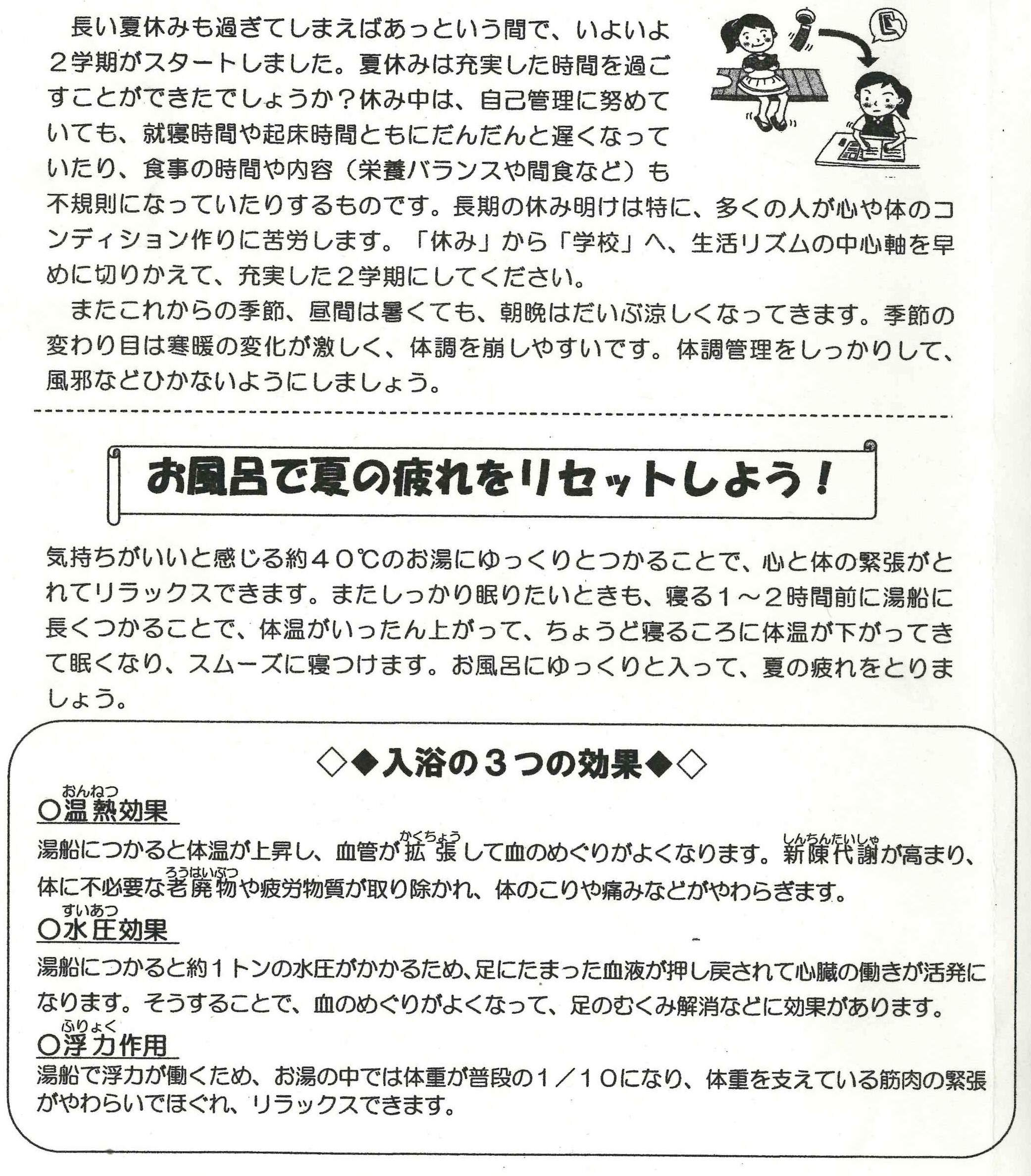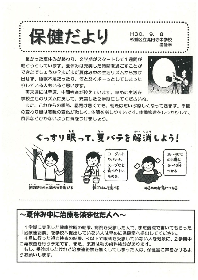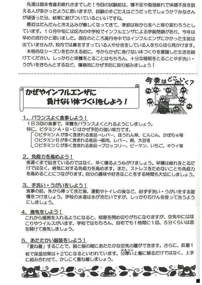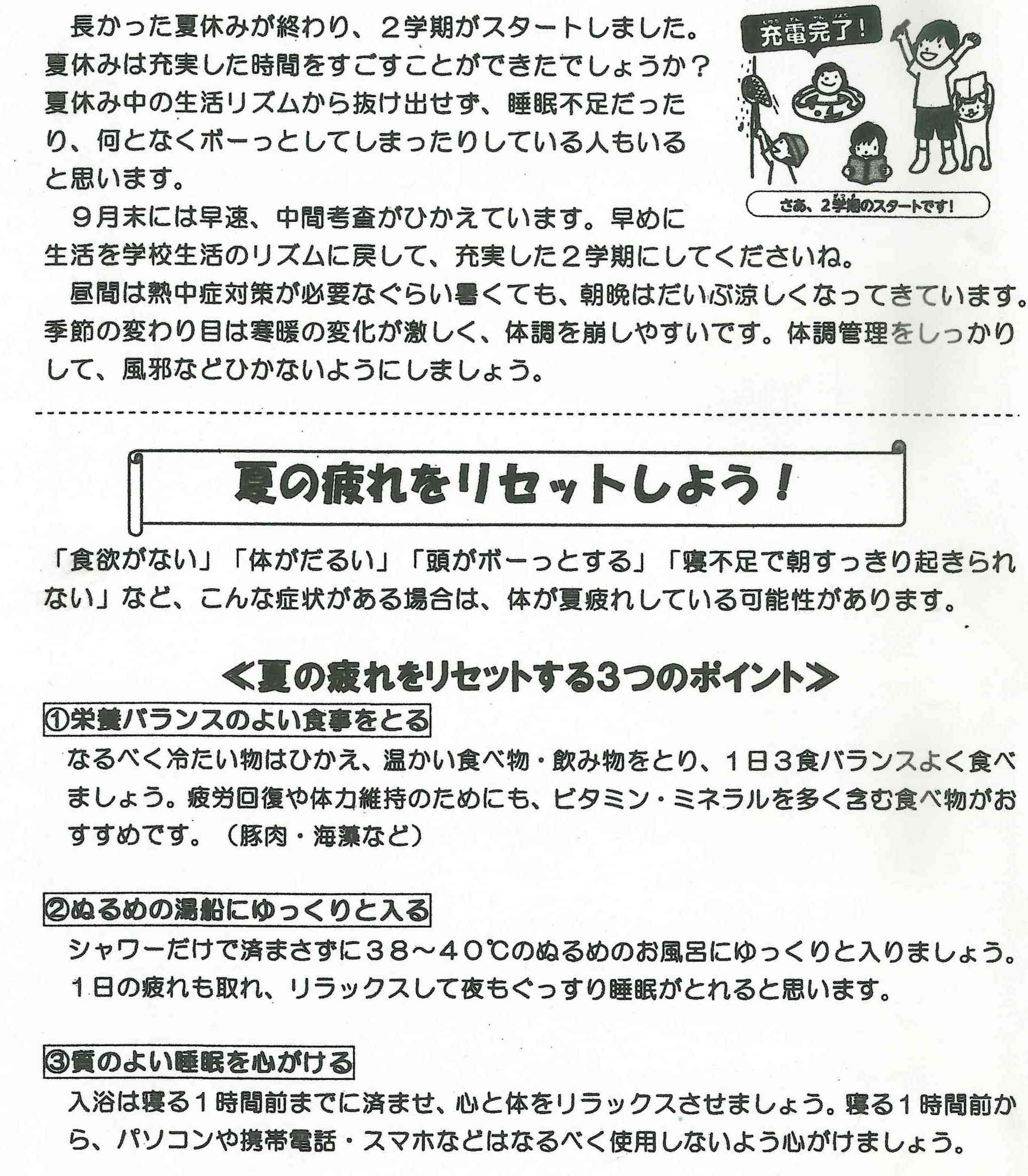 充実した夏休みを過ごしたことと思います。昨日から2学期が始まりましたが、休み中の生活リズムから抜け出せず、睡眠不足だったり、何となくぼーっとしている人もいることと思います。9月末には中間テストもひかえています。また、季節の変わり目は寒暖の差が激しく、体調を崩しがちです。夏の疲れをとり体調管理をしっかりおこなっていきましょう。
