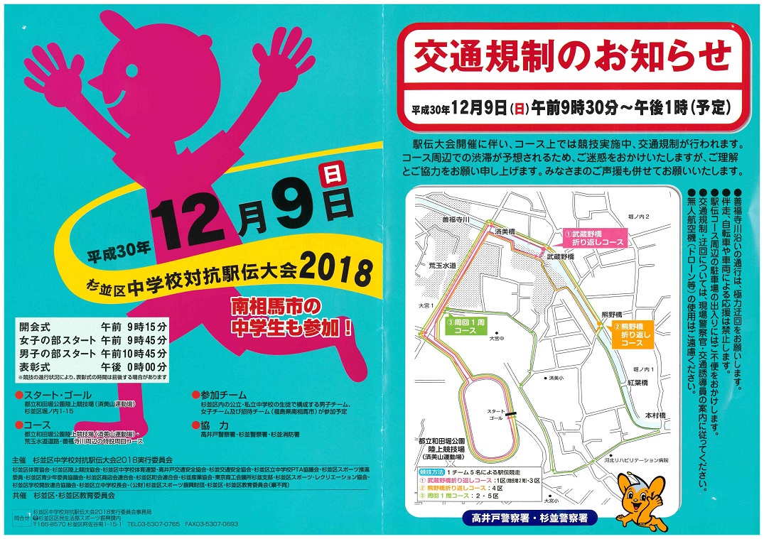 次代を担う子供たちに夢と喜びを広めるために、平成12年に開始した杉並区中学校対抗駅伝大会も、今年で15回目を迎えることになりました。都立和田堀公園陸上競技場(済美山運動場)を発着点・中継点として、競技場内と荒玉水道道路を周回するコースで開催します。また、交流自治体である福島県南相馬市のチームも招待します。皆様のあたたかいご声援をお願いします。
