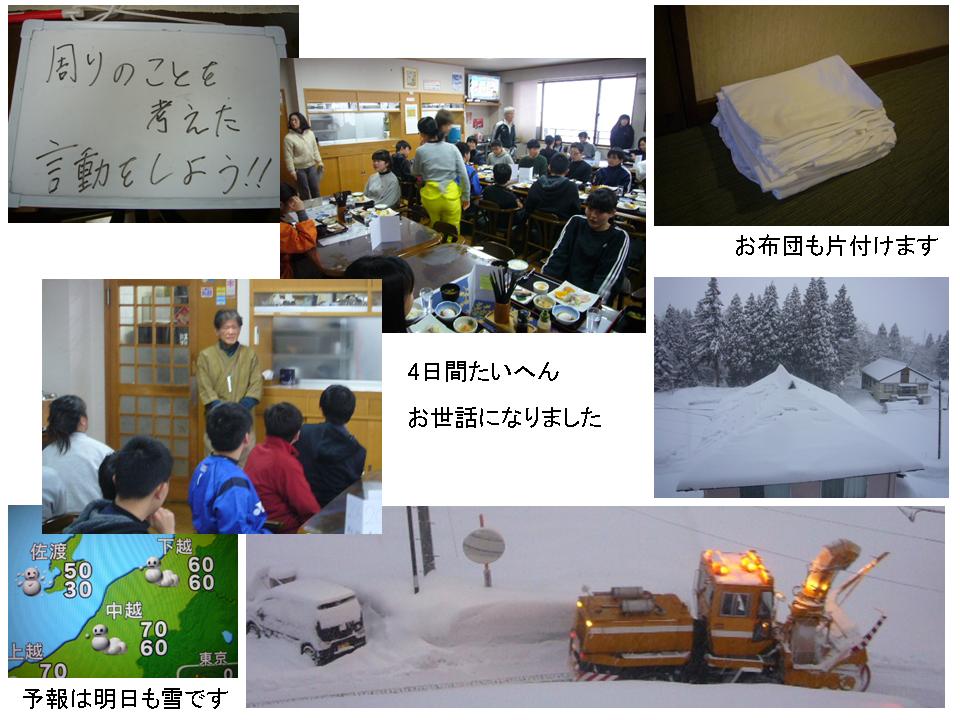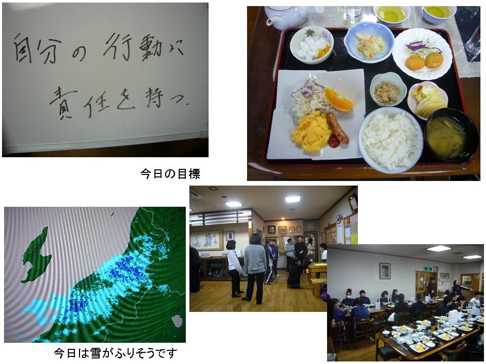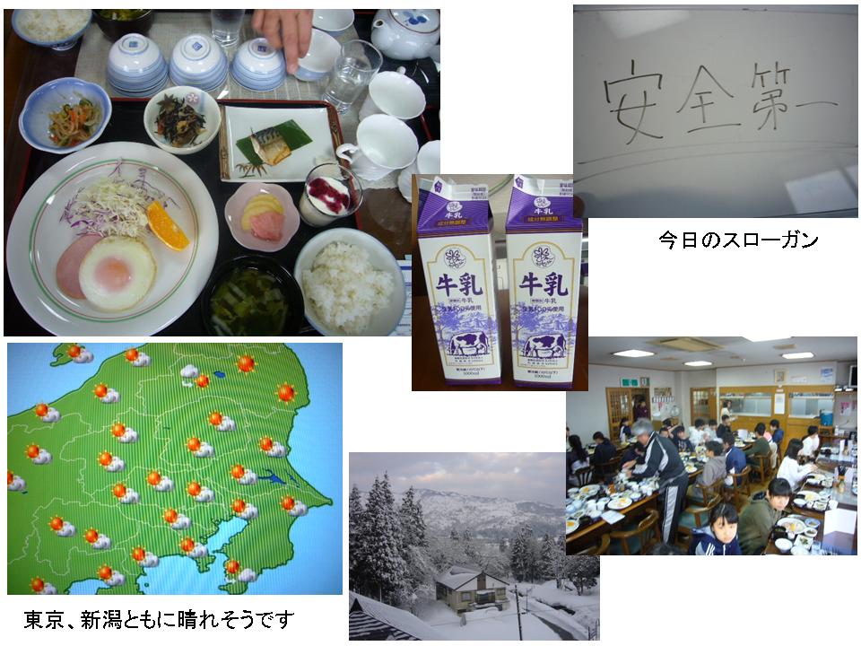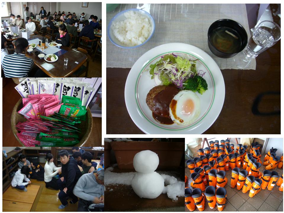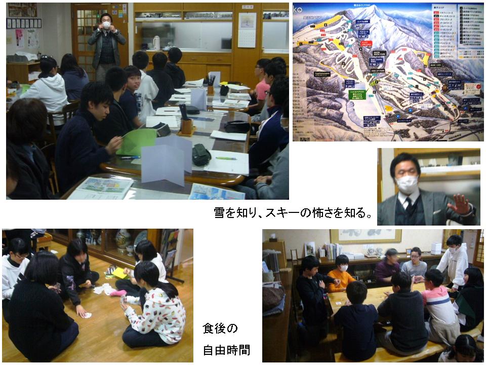 0700起床→0730朝食→0900講習→昼食・休憩→1330講習→軽食→1630ナイタースキー1740→夕食→入浴→2200消灯