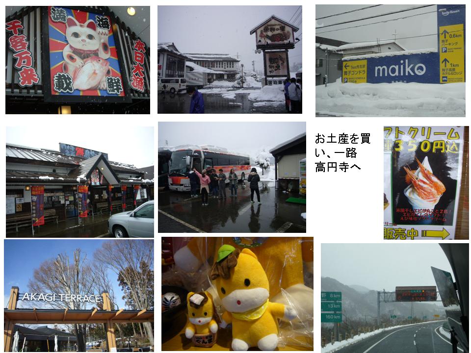 0700起床→0730朝食→0800退館→0900講習→1130閉校式→1220昼食→1300お土産→1340出発→赤城高原SA・高坂SA→1700解散