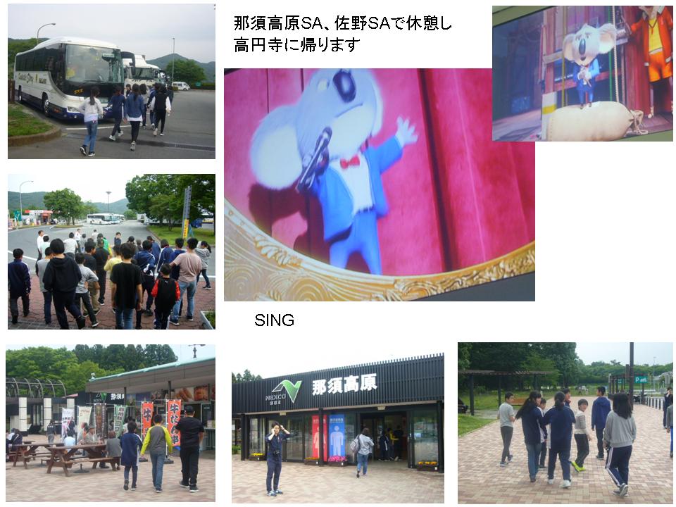 起床・閉校式→1000野口秀雄記念館→1100お土産購入・昼食1230→那須塩原SA→羽生PA→1630学校(解散)