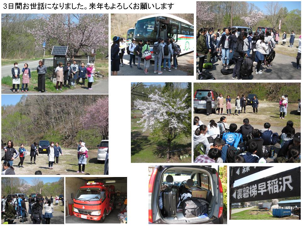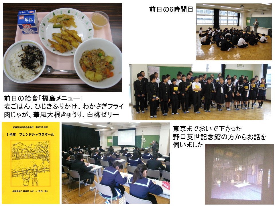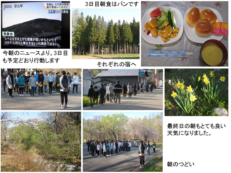 0600起床→0645朝会→0730朝食→0830奉仕活動→1030野口英世記念館→1200昼食→那須高原SA→羽生PA→1700学校