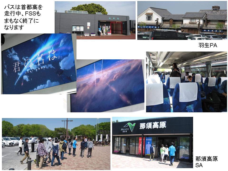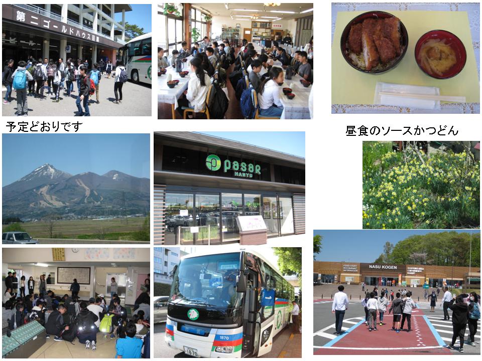 0730学校集合→0750出発→0920羽生PA→1050那須塩原SA→1220昼食