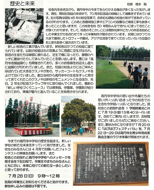 今の校舎もあとわずかということで、この校舎で同期会等を予定しているところもあり、いくつか問い合わせをいただいています。現校舎があるうちにとお考えの期がございましたら、学校までご相談くださいますようお願いいたします。(橋本 剛)