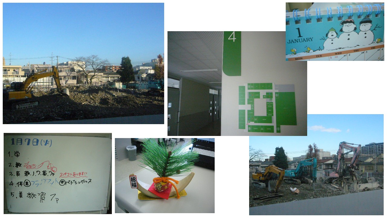 新校舎教室の窓からは、今までとはちょうど逆で、取り壊し工事準備中の旧校舎を見ることができます。これから約1年間、新しい校庭ができていく風景を見ながら、小学生とともにつくる9年間の学年生活を今までの常識にとらわれることなく、素敵な9年間として見通していくために、中学生各教室の7年、8年、9年という学年表記を強く自覚してくれていることと思います。今学期もよろしくお願いします。(橋本 剛)