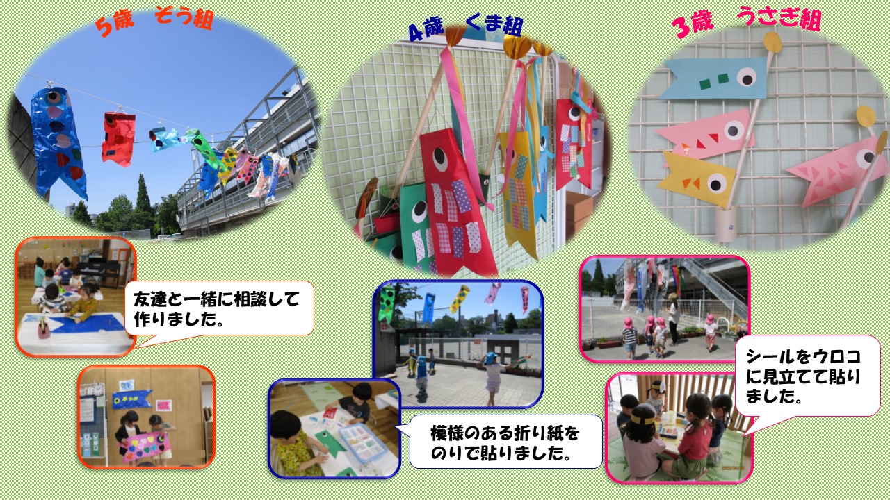 【こいのぼり】 5歳児が作ったこいのぼりを見て、3歳児も4歳児も自分だけのこいのぼりを作りました。