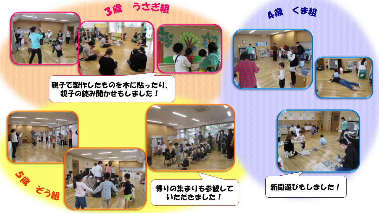 【親子で遊ぼう】 学級ごとにおうちの人と一緒に体を動かしたり、ふれあい遊びをしたりして楽しく過ごしました。