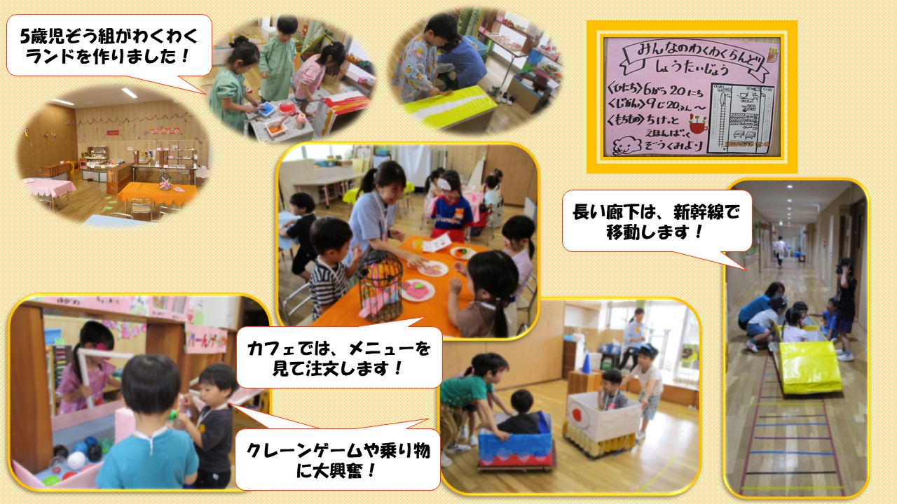 【ごっこ遊び】 井の頭公園へ遠足に行った5歳児ぞう組が、楽しかった経験をごっこ遊びとして再現しました。うさぎ組やくま組、おうちの人を招待して『みんなのわくわくらんど』を楽しみました。
