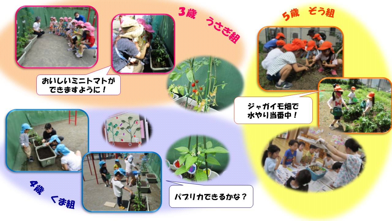 【栽培】 3歳うさぎ組は、ミニトマトとオクラ。4歳くま組は、パプリカとエダマメ。5歳ぞう組は、ジャガイモ、ナス、キュウリ、ピーマン。と、いろいろな野菜を育てました。