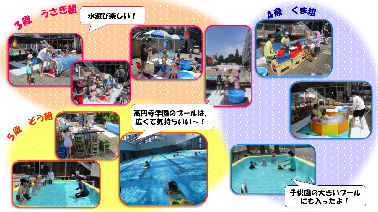 【水遊び】 学年にあわせて、夏ならではの水遊びを楽しみました。5歳児は、高円寺学園のプールにも行きました。