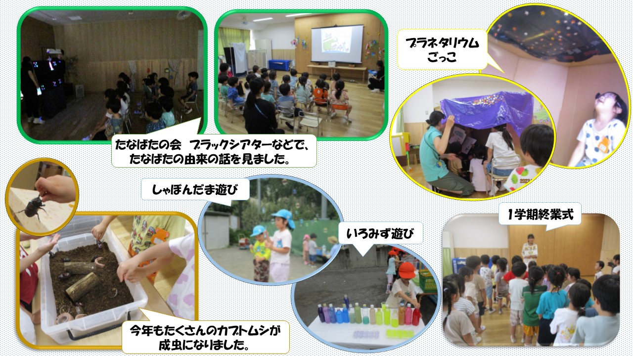 【1学期が終わりました】 1学期の間に園生活に慣れ、先生やお友達とたくさん遊びました。