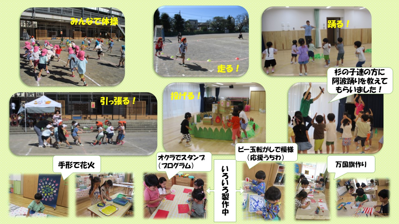 【もうすぐ運動会】 グラウンドやホールで遊びを通して体を動かすことを楽しんでいます。また、運動会の雰囲気を盛り上げる製作もしています。