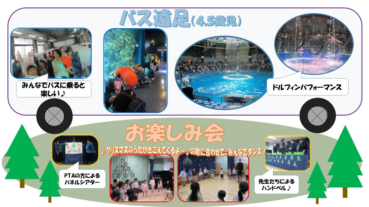 【バス遠足】5歳ぞう組と4歳くま組が、バスに乗ってマクセルアクアパーク品川に行きました。 【お楽しみ会】パネルシアターを観たり、ハンドベルの演奏を聴いたり、みんなでダンスをしたりして楽しみました。