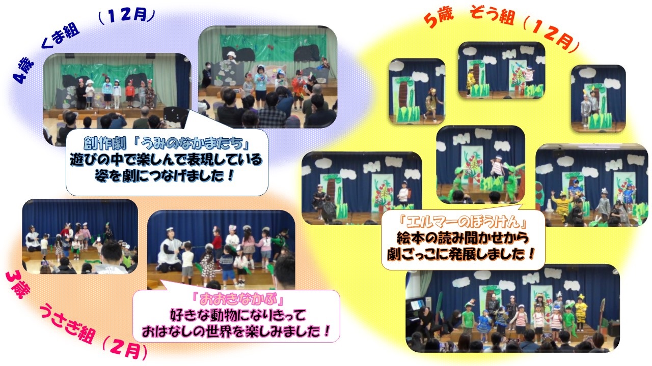 【子ども会】遊びの中で楽しんでいることを歌や劇ごっこで表現し、おうちの方が見に来てくれました。5歳児と4歳児は12月に行い、3歳児は2月に行いました。
