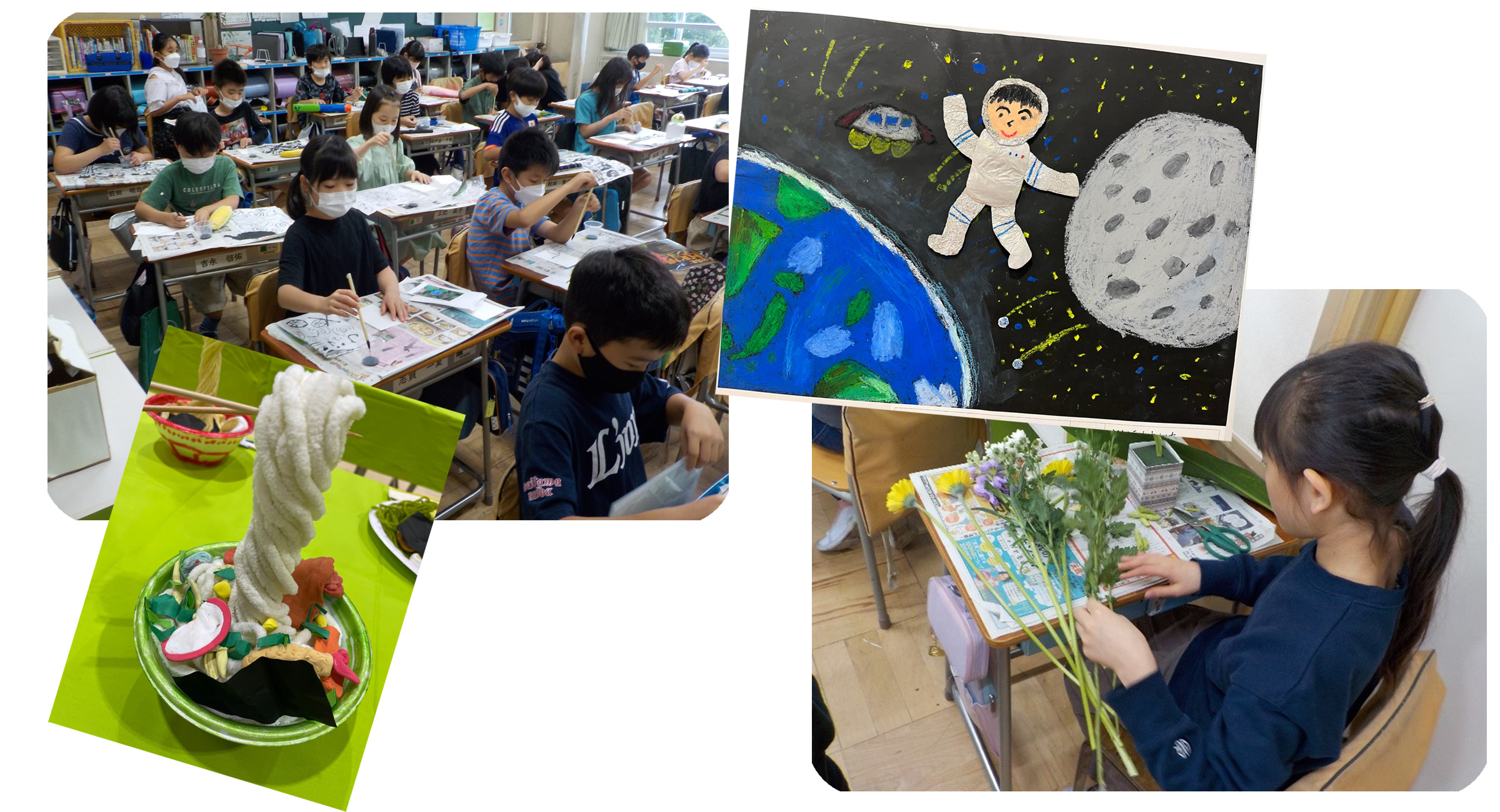 4年生 4年生 展覧会がありました 1学期から展覧会に向けて作品を制作してきました。4年生は、マスキングテープと絵の具を使って描いた花、コーヒーで黄ばみをつけた紙に書いた宝の地図、ペットボトルキャップをタイヤにした車をつくり、展示しました。制作の様子です。 2025.11.07 4年生未分類