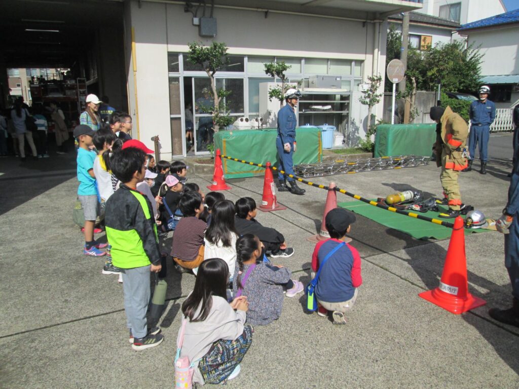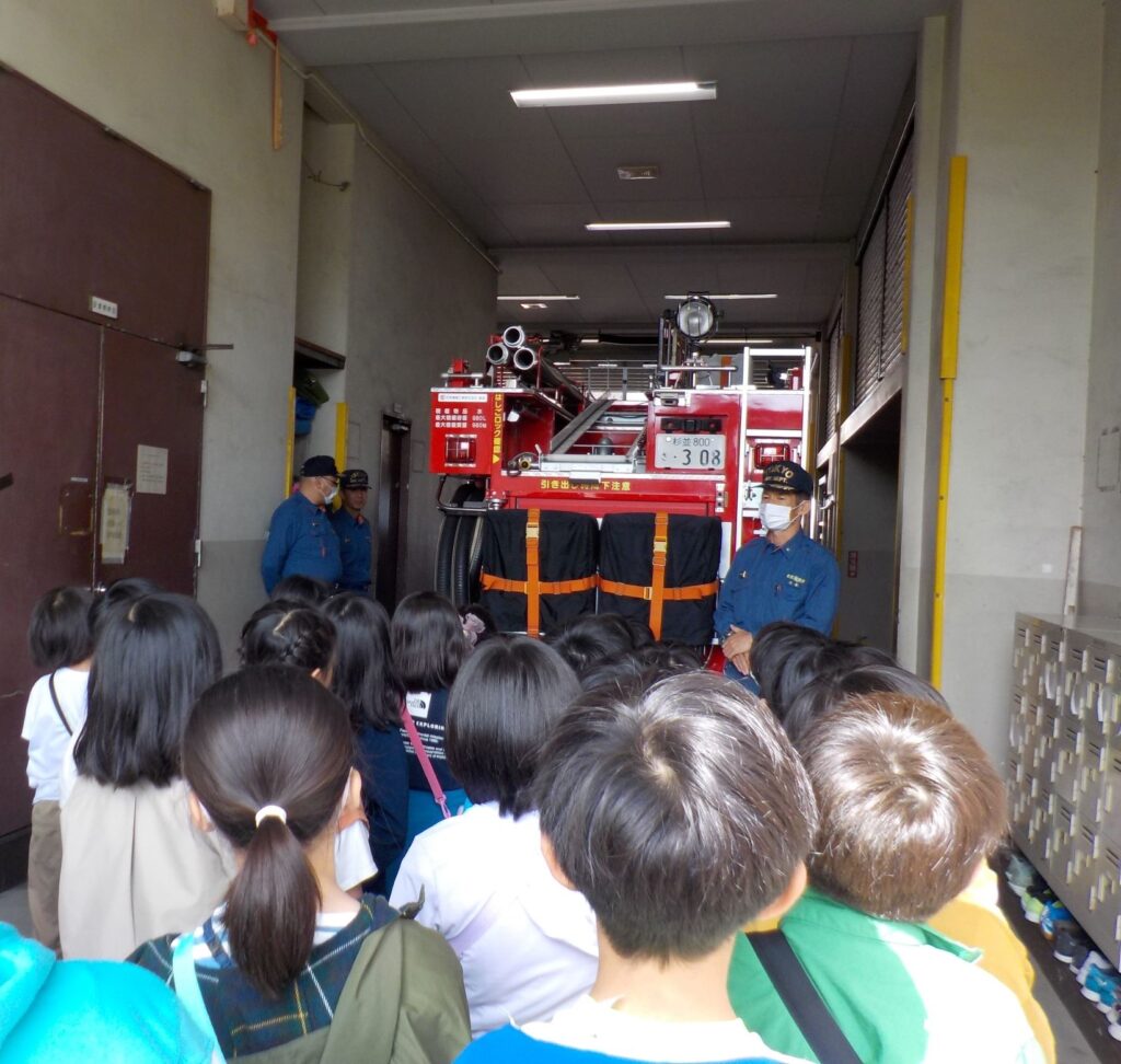 社会科「ちいきの安全を守る」の学習で、消防署見学に行きました。消防士の訓練の様子や消防車のしくみを実際に見て、学びを深めることができました。