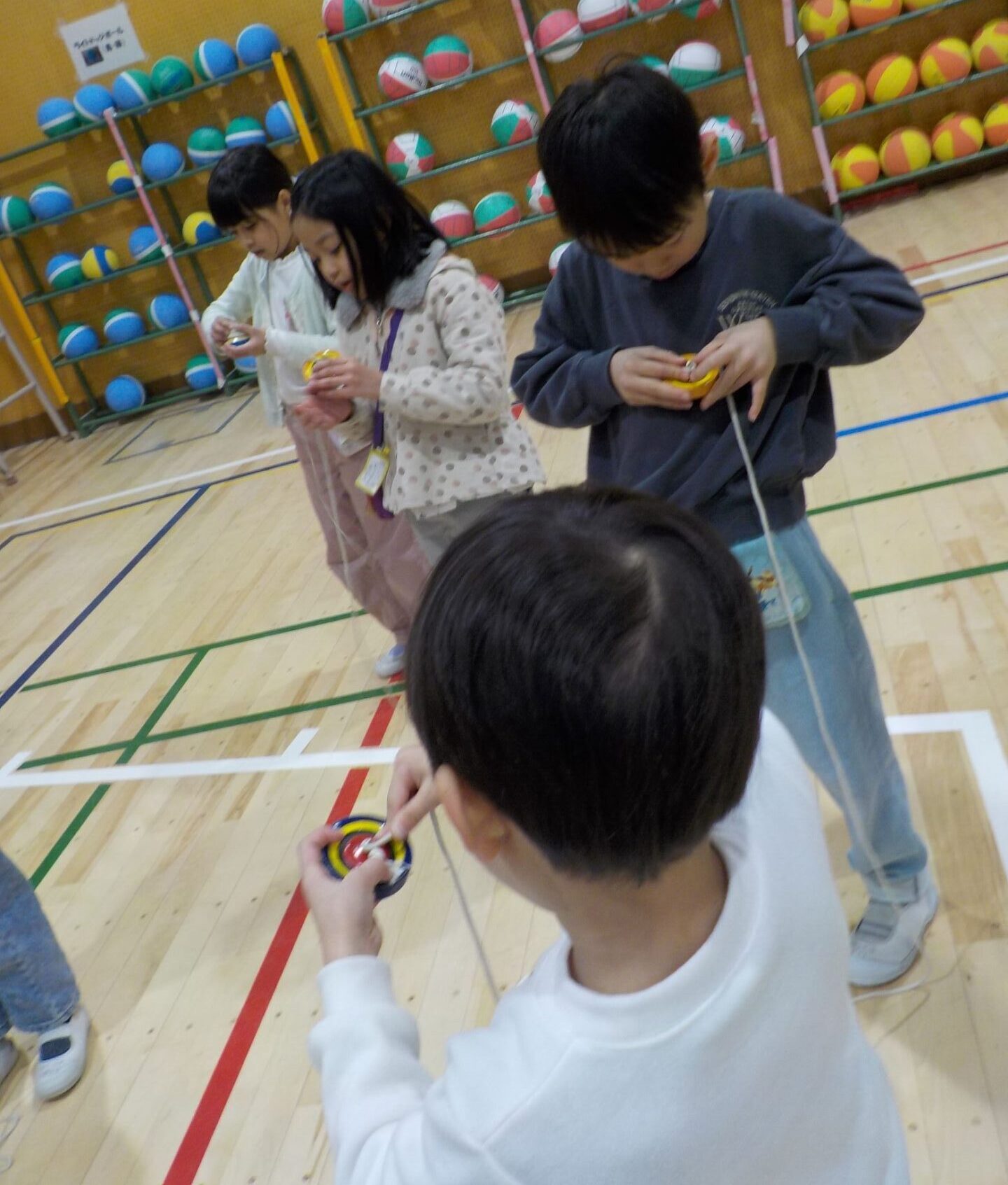 1年生1月10日に、生活科「ふゆをたのしもう」の学習で地域の方を招いて昔遊びの体験を行いました。こまやけん玉、あやとり等、8種類の昔遊びを教わりました。はじめは「どうやるの?」と不安そうにしていた子どもたちも、すすんで楽しそうに遊んでいました。活動後、いただいたおもちゃで休み時間も楽しそうに遊んでいます。地域の方と関わる時間は、子どもたちにとって貴重なものとなりました。