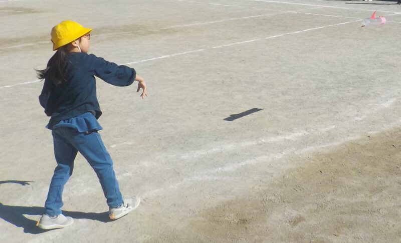 1年生生活科の学習で、凧やかさぶくろロケットなど、風を利用して遊ぶおもちゃを作り、校庭で遊びました。作った凧がどうしたら飛ぶのか考えながら走っていました。そのうちに「風向きはどっちだ」という声が聞こえてきて、上手に風をつかって凧を飛ばしていました。