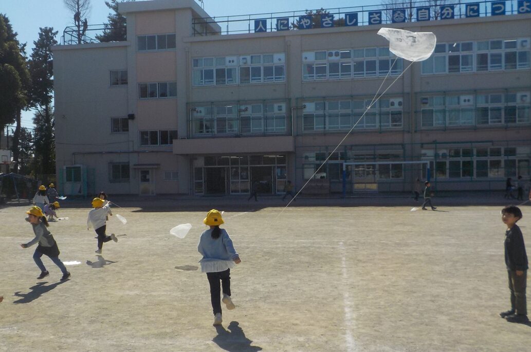 1年生生活科の学習で、凧やかさぶくろロケットなど、風を利用して遊ぶおもちゃを作り、校庭で遊びました。作った凧がどうしたら飛ぶのか考えながら走っていました。そのうちに「風向きはどっちだ」という声が聞こえてきて、上手に風をつかって凧を飛ばしていました。