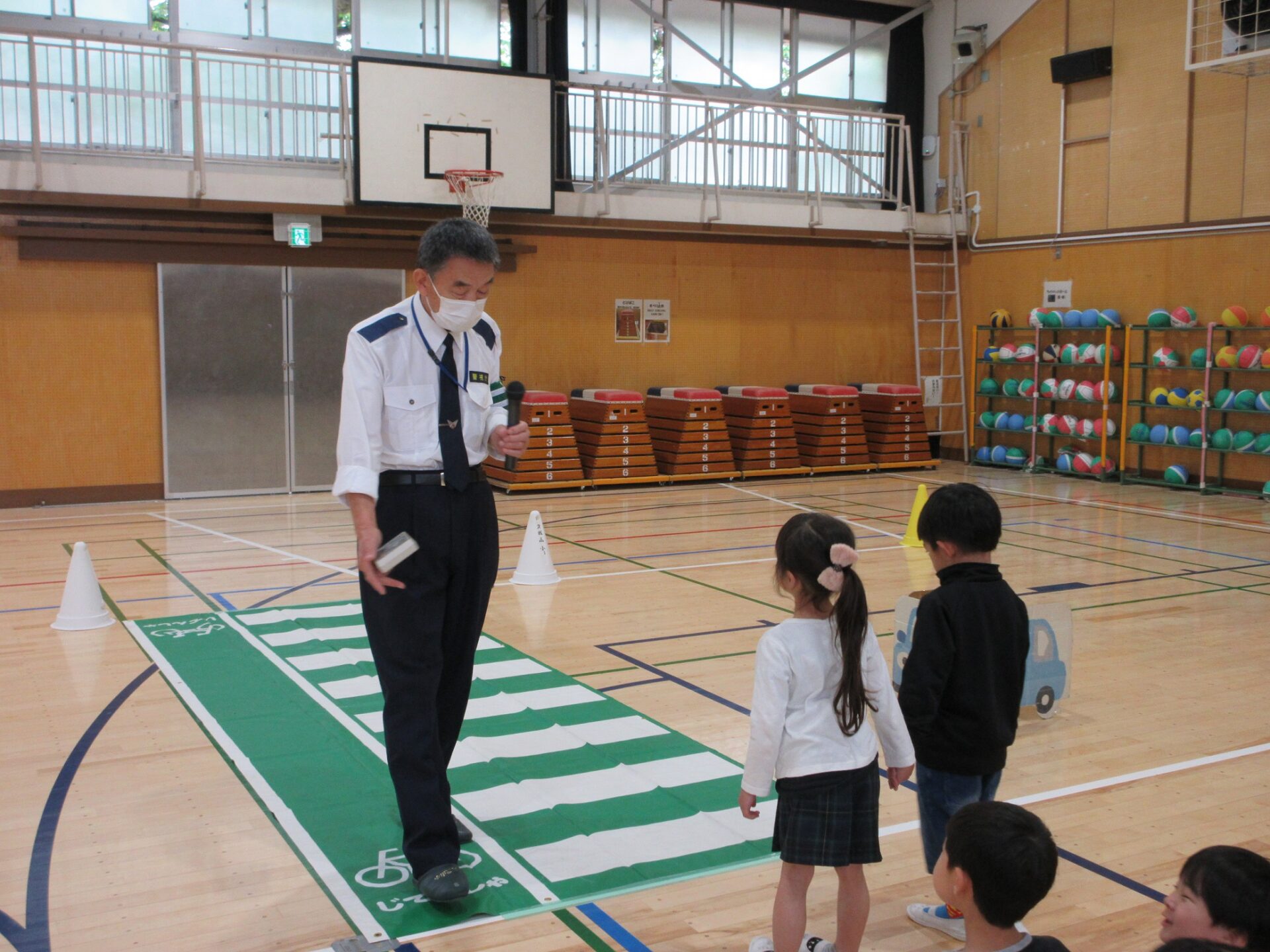 交通安全教室が行われました。安全な歩行や横断歩道の渡り方を高井戸警察署の方に教えていただきました。2人ずつ実際に歩行練習をしました。