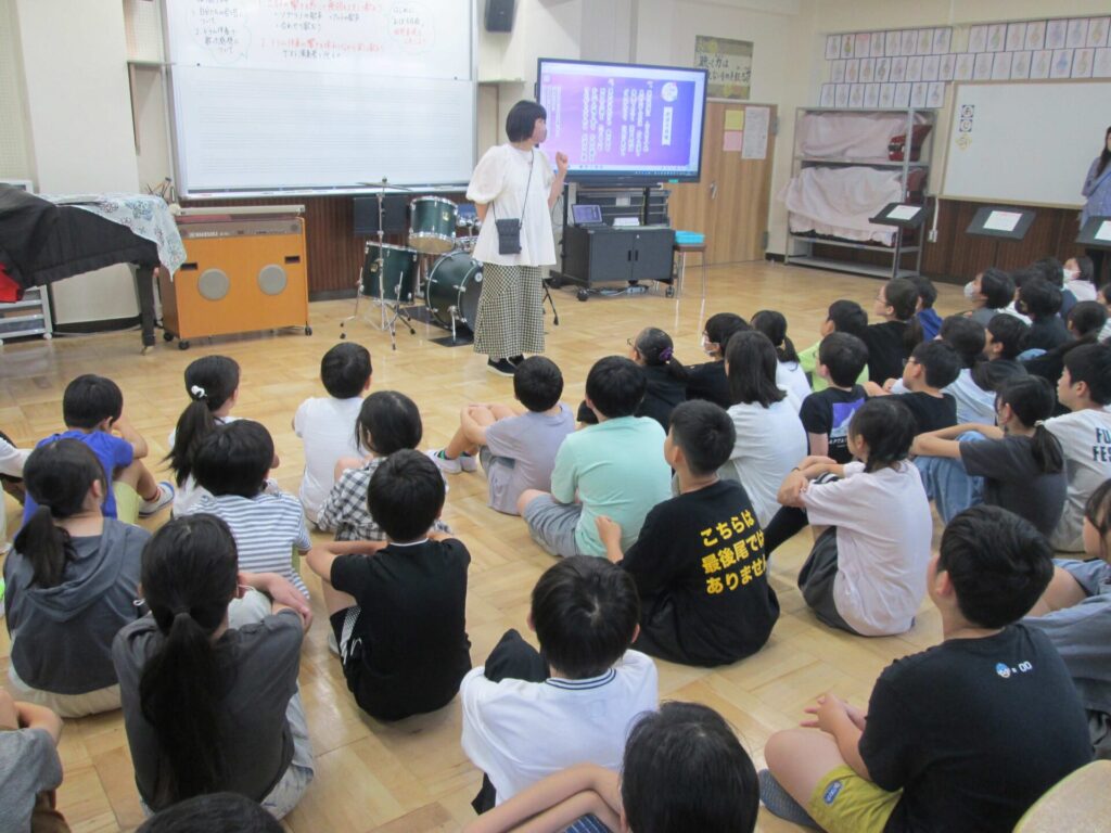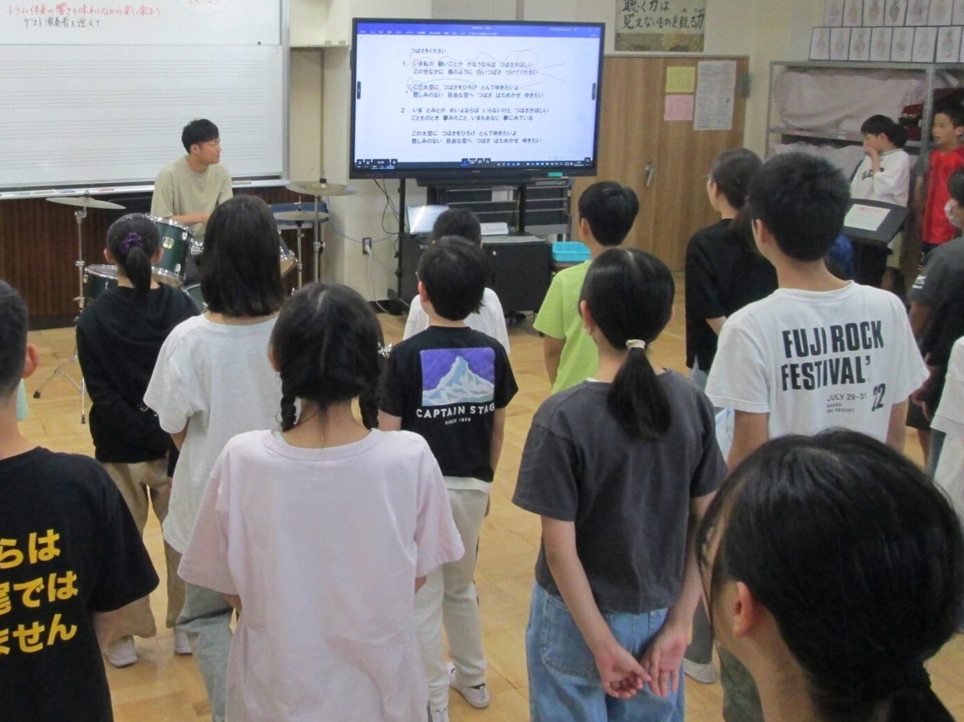 特別ゲストを迎え、「翼をください」をドラム&ピアノ演奏のもとで歌いました。いつものピアノとはまた違った雰囲気の伴奏で、子どもたちはいろいろなことを感じたようです。