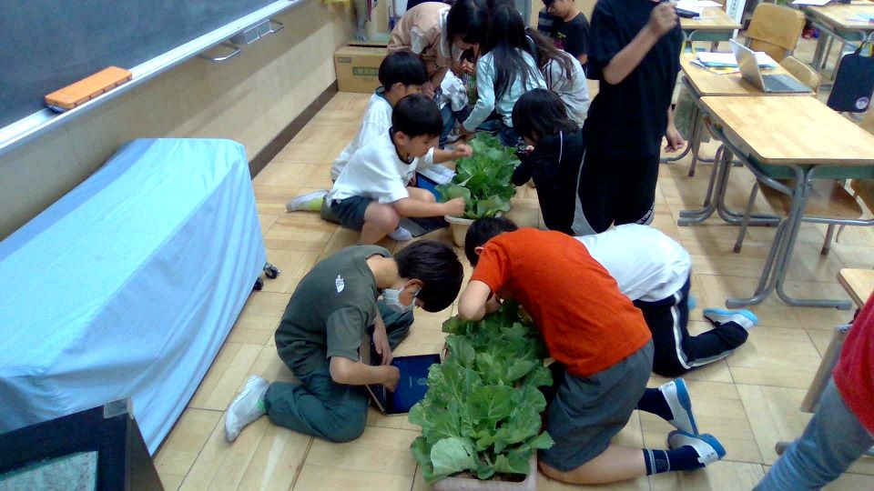 2組 理科の学習で昆虫の幼虫を観察している様子