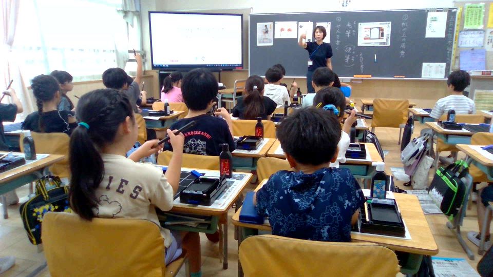 3年生1組 書写の学習で初めて毛筆を扱う様子