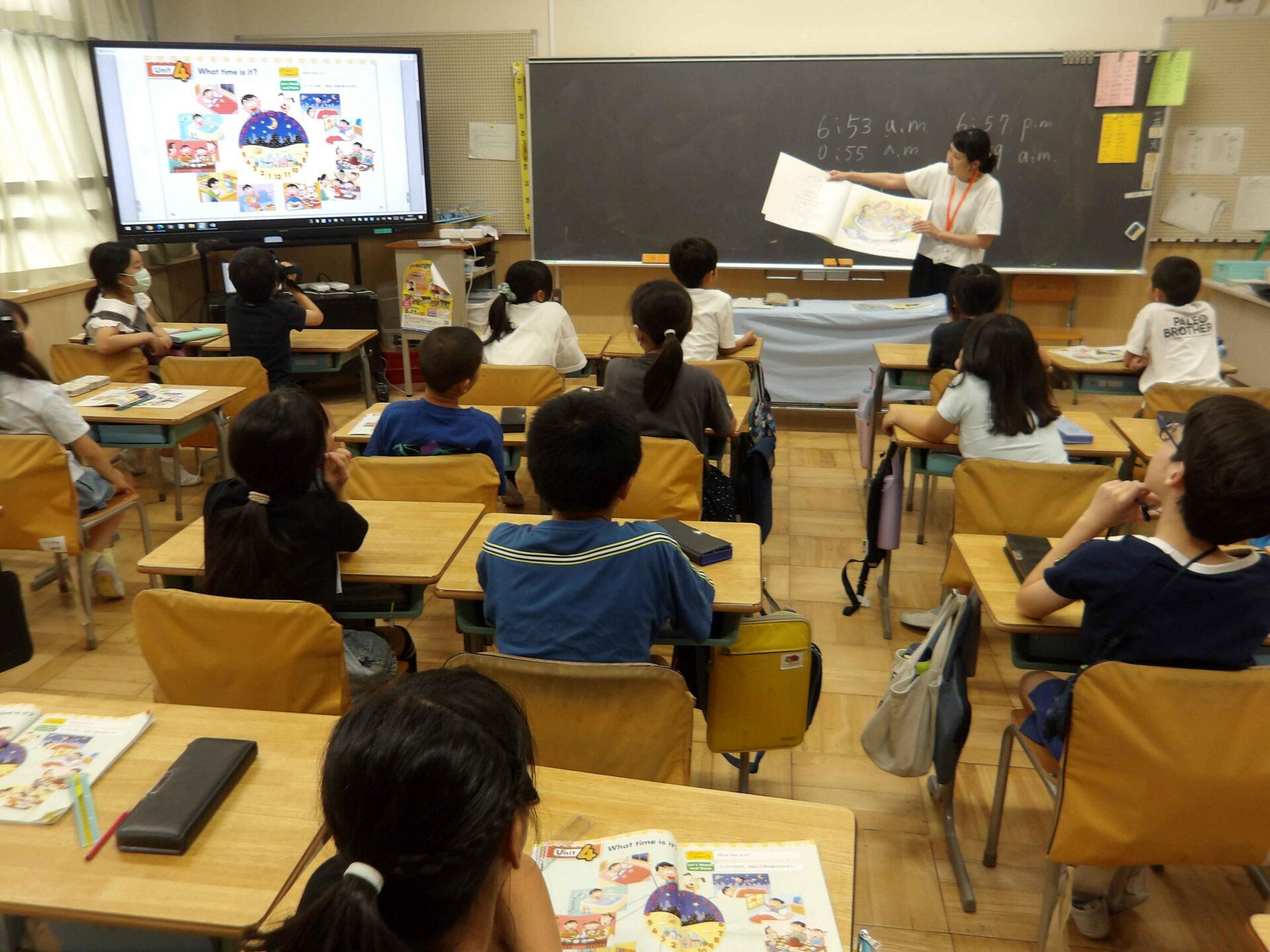 外国語活動の取り組み 4年生 2025.07.152025.07.18 4年生では、年間35時間の外国語活動があります。そのうち、8時間程度、JTEの先生も一緒に指導にあたっています。 今日は、時刻の表現を使った英語の絵本の読み聞かせをしていただきました。真剣に聞く子どもたちでした。