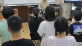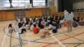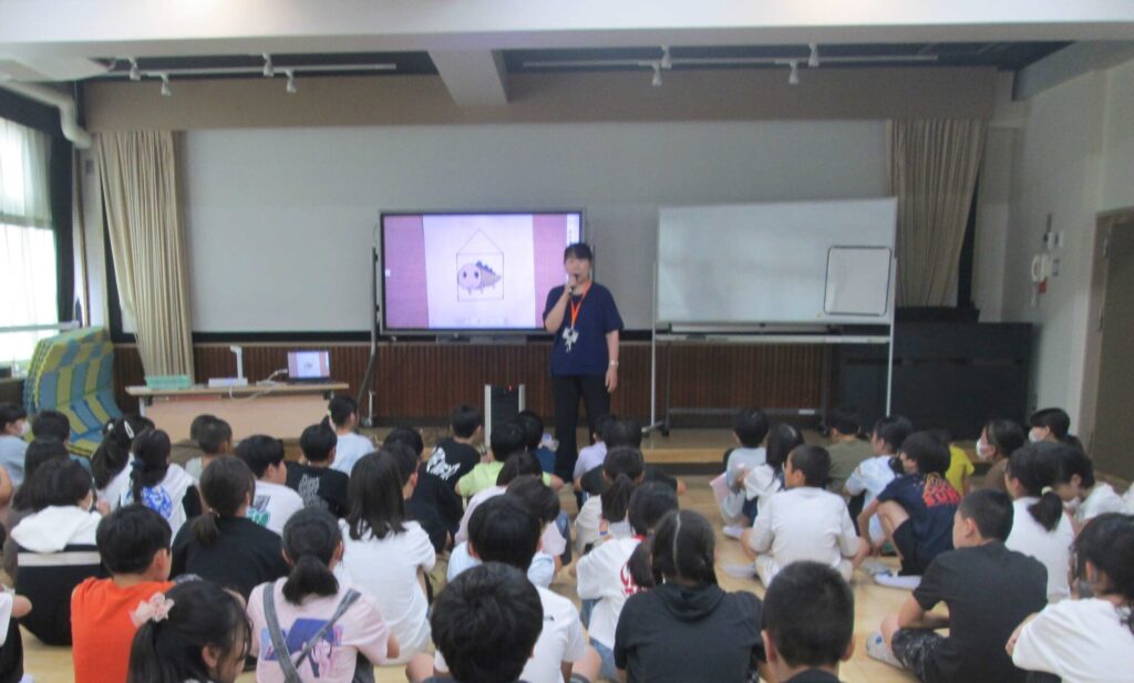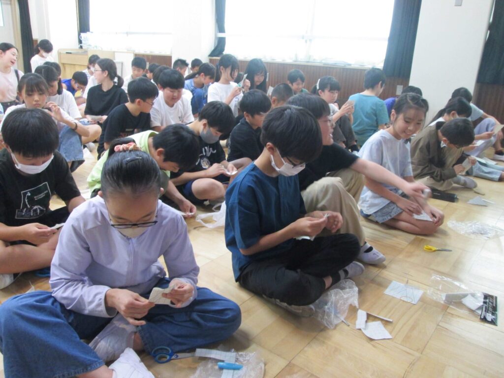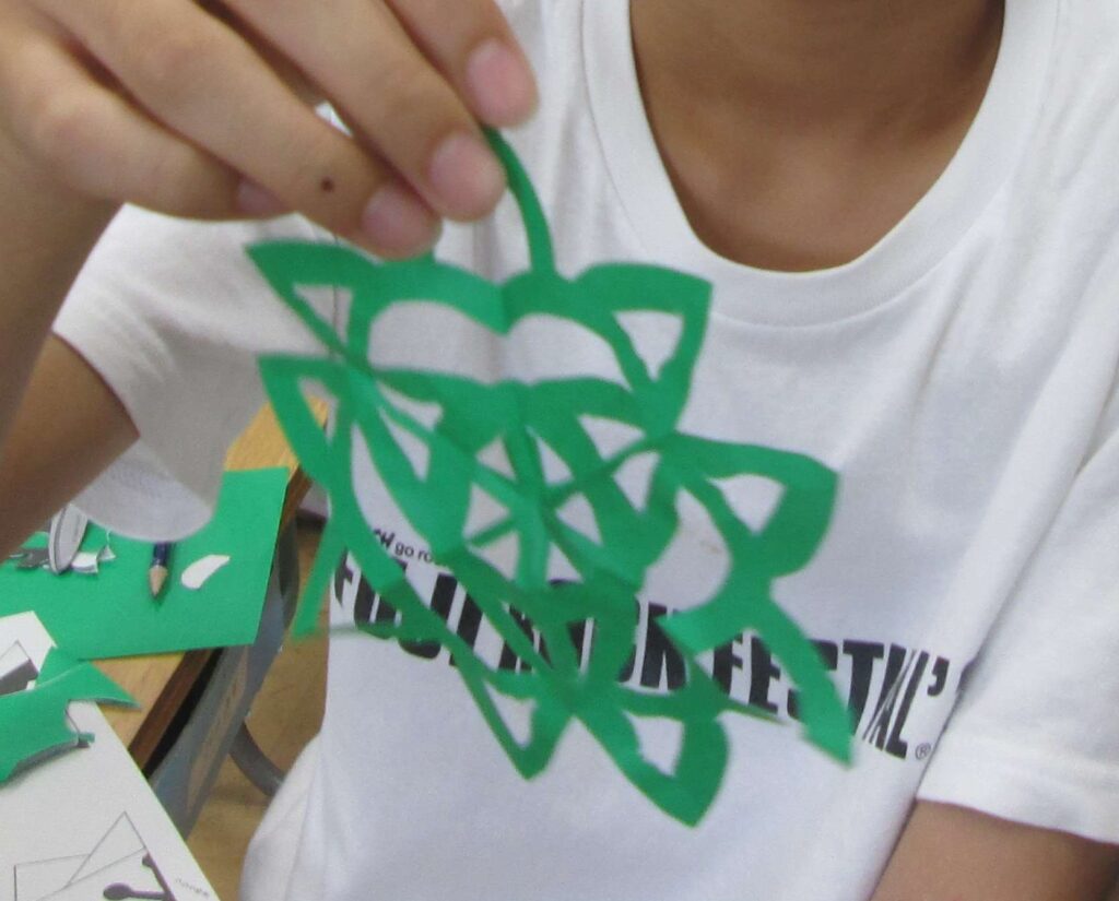 14日は、学年全員でウォーミングアップ。アルファベットの「X」や「T」、「A」をハサミの一刀切りで作れるか…!子どもたちは、うんうん頭を悩ませながら取り組みました。