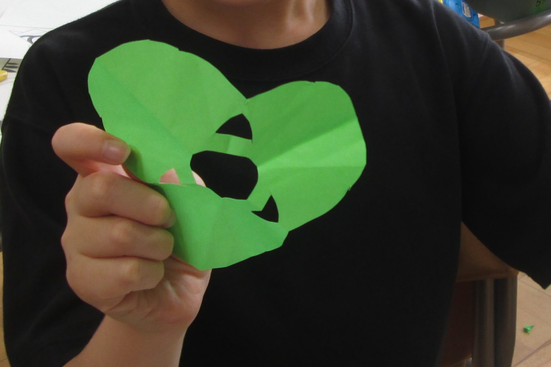 15日は、前日の学習を生かして複雑な図形に挑戦しました。「こうもりの目ができない!ずるだけど、コンパスで穴を開ければ…!」という子に対して、「対称だから折ったら両目ができるよ」と教え合う姿が見られました。きれいな図形ができたときには、毎回担任に見せに来るくらい嬉しそうでした。