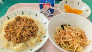 大豆入りドライカレー、ごはん、サウピカンサラダ、デコポン、牛乳ごはんの上には、ひき肉や野菜に加えて大豆を使ったドライカレーがたっぷりとかかり、栄養も食べ応えも十分です。さっぱりとしたサウピカンサラダとの組み合わせで、バランスよく楽しめる献立...
