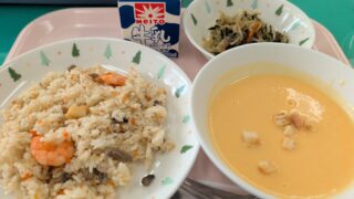 シーフードピラフ、ポタージュ、なんでもせんぎりサラダ、牛乳今日の給食は、プリッとしたエビややわらかなイカが入ったシーフードピラフが主役です。お皿には具材の彩りが広がり、見た目から食欲をそそられます。付け合わせの「なんでもせんぎりサラダ」は、...
