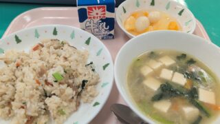中華菜飯、中華スープ、しらたまフルーツポンチ、牛乳今日の給食は、中華風の味わいが楽しめる「中華菜飯」と、やさしい旨味が広がる「中華スープ」の組み合わせでした。お皿の上の混ぜご飯には、小松菜やにんじん、豚肉などの具材がたっぷり入り、どこを食べ...