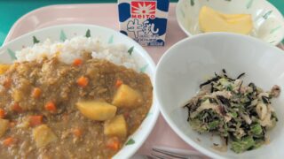キーマカレーライス、ゆずごまサラダ、りんご、牛乳今日の給食は、あたたかいキーマカレーライスに、さっぱりとしたゆずごまサラダが添えられた組み合わせでした。写真からも、ひき肉と野菜の旨味がぎゅっと詰まったカレーの湯気がほわりと立ち上り、食欲をそ...
