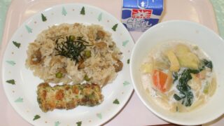 キムチチャーハン、ししゃも、中華スープ、牛乳「ししゃも」には、体の中で重要な働きをする「アミノ酸」がバランスよく含まれています。記憶や学習に効果のあるDHA もたくさん含まれています。また、貧血予防になる鉄分、骨や歯の健康を保つために欠かせ...