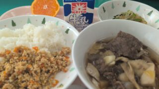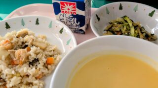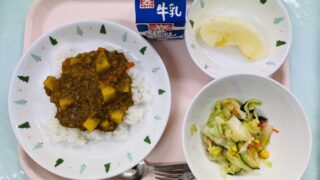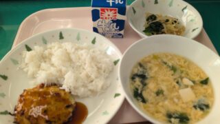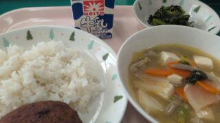 麦ごはん、牛乳、鶏ごぼうハンバーグ、かきたま汁、野菜の甘醤油和え19日は、食育の日です。食育とは、食に関する知識を親や他の大人から学び、健康な食生活を送れるように育てることです。私たちの体は食べ物から出来ています。安全な食品をバランス良くと...