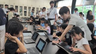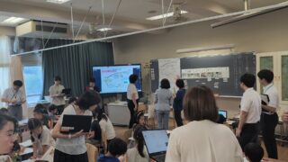 6年生は本日、東京の理科を専門とする先生方に向けて研究授業を行いました。テーマは「月と太陽」。太陽と月の位置関係によって、月の形がどのように見えるのかを、モデル実験を通して探究しました。教室を暗くしてライトを太陽に見立て、球を月に見立てて観...