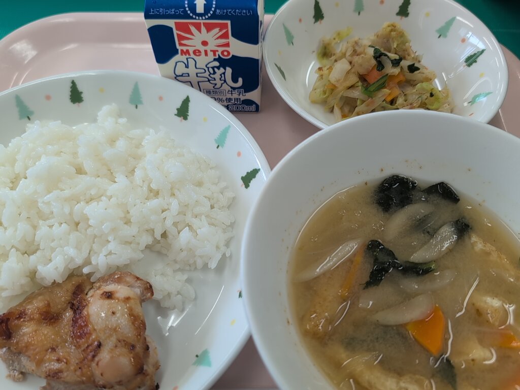 麦ごはん、牛乳、とり肉の生姜焼き、野菜のみそ汁、キャベツのおかか和え