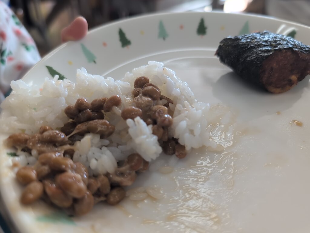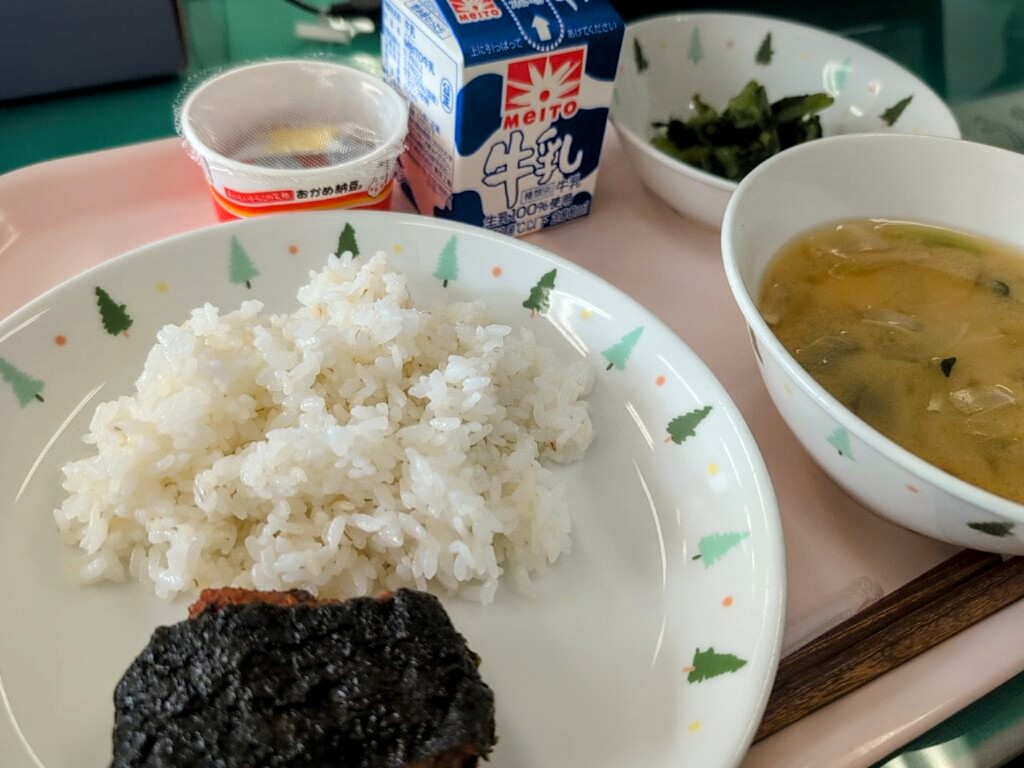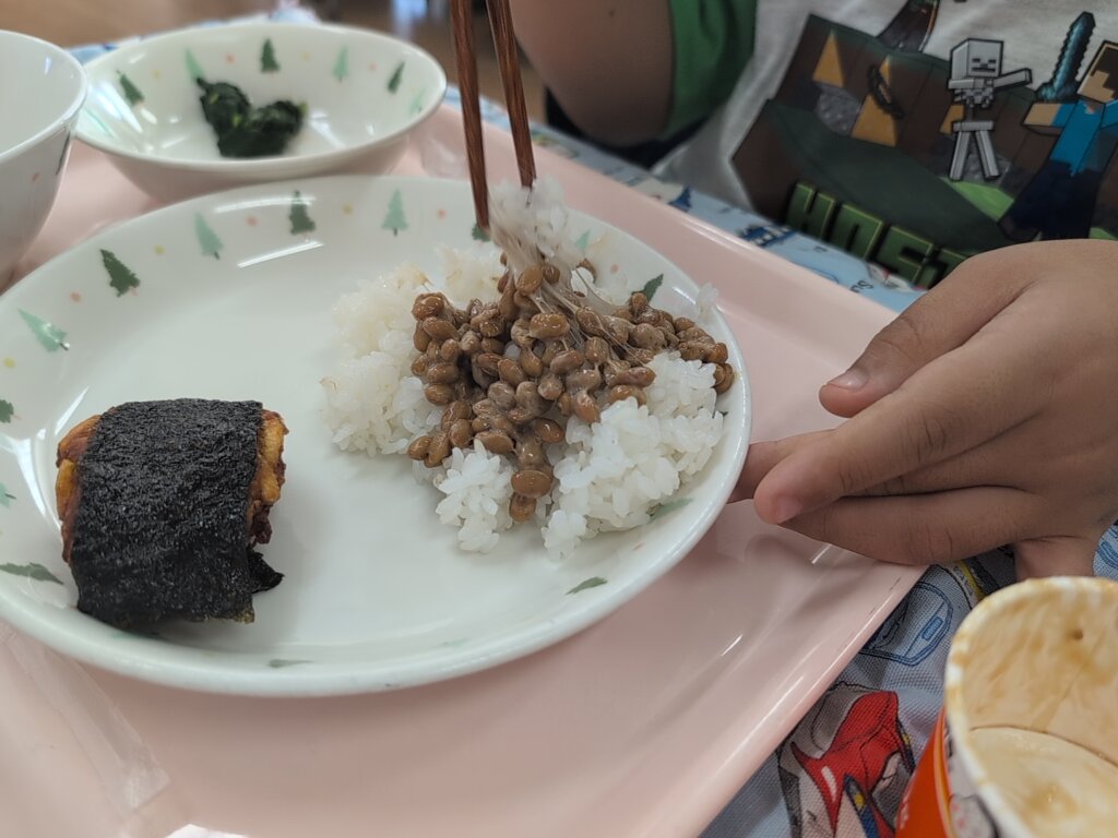ごはん、納豆、牛乳、のりあげくん、みそ汁、野菜の甘醤油