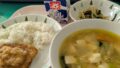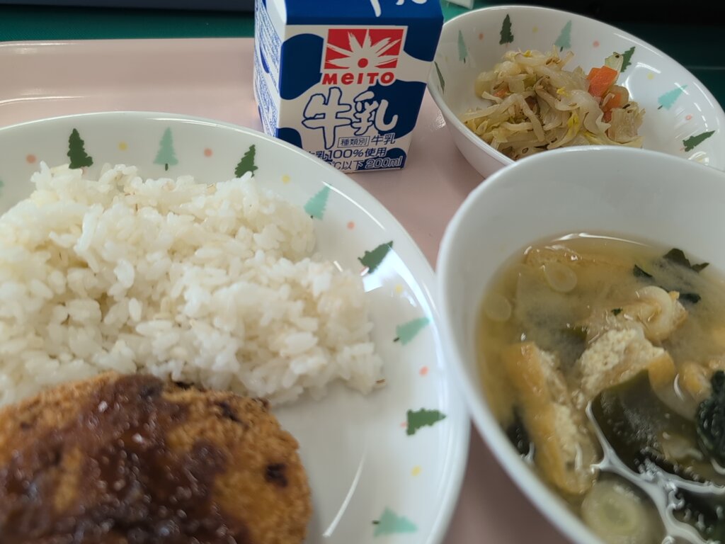 学校全体麦ごはん、おから入りメンチカツ、みそ汁、三色和え、牛乳