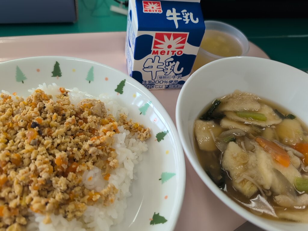 学校全体高野豆腐のそぼろごはん、せんべい汁、果肉入りリンゴゼリー、牛乳